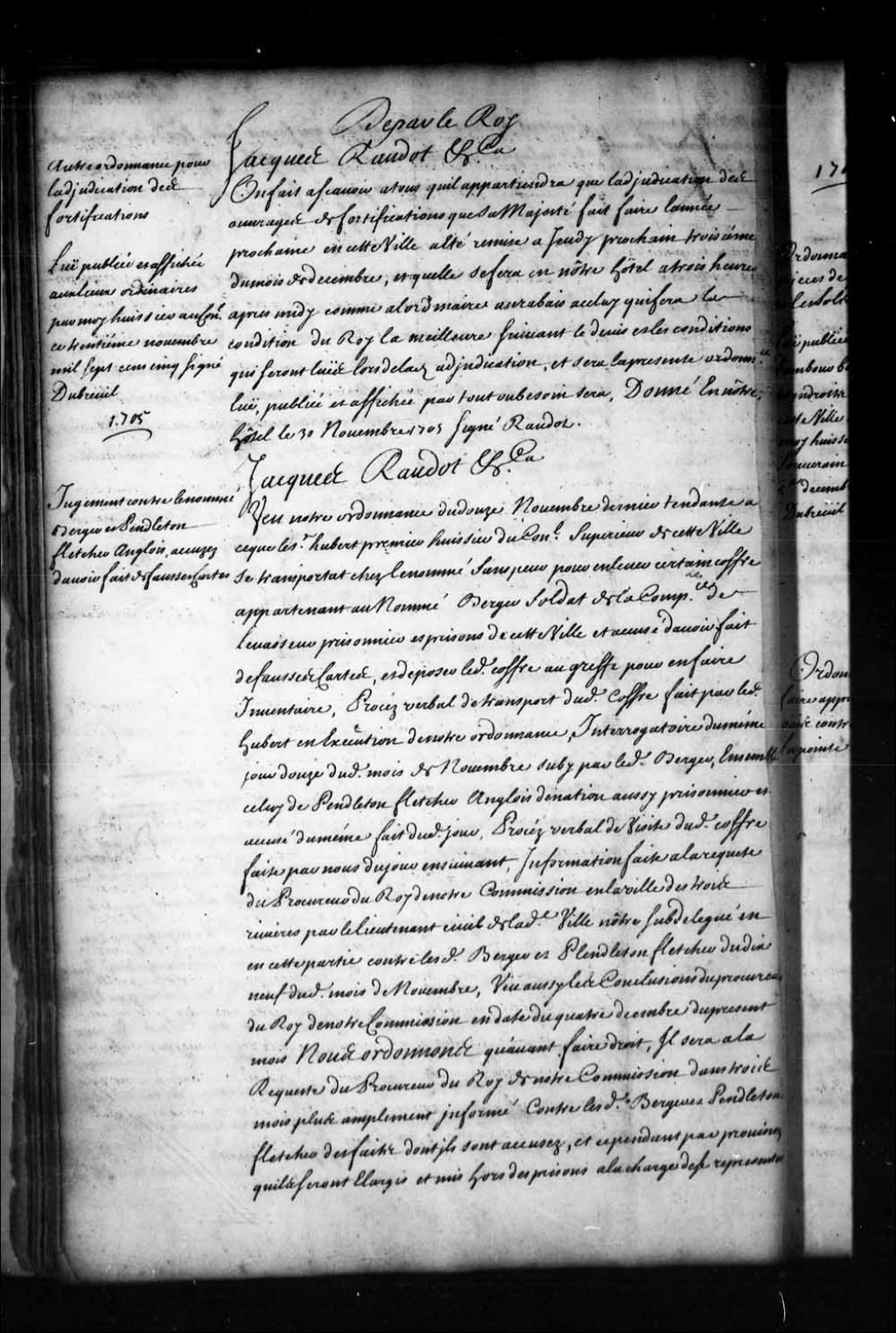 Ordonnance de l'intendant Jacques Raudot contre Jean Berger, soldat de la compagnie de Levasseur, et Pendleton Fletcher, Anglais de nation, tous deux détenus dans les prisons de Québec, accusés d'avoir fait de fausses cartes (monnaie de carte), laquelle ordonnance porte qu'il sera plus amplement informé contre les lesdits Berger et Fletcher dans les trois mois des faits dont ils sont accusés et qu'ils seront cependant élargis et mis hors des prisons à charge de se présenter à toute assignation, 5 décembre 1705, Archives nationales à Québec, Fonds Intendants, (03Q,E1,S1,D1,P45).