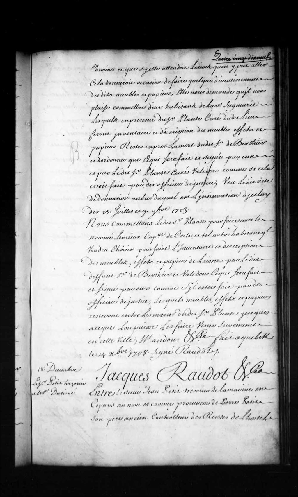 Ordonnance de l'intendant Jacques Raudot entre le sieur Jean Petit, trésorier de la Marine, au nom et comme procureur e Pierre Petit, son père, ancien contrôleur des rentes de l'Hôtel de ville de Paris, et le sieur Claude-Charles Dutisné, qui condamne ledit Petit à payer une somme, auparavant modérée, audit Dutisné, 18 décembre 1708, Archives nationales à Québec, Fonds Intendants, (03Q,E1,S1,D2,P450).