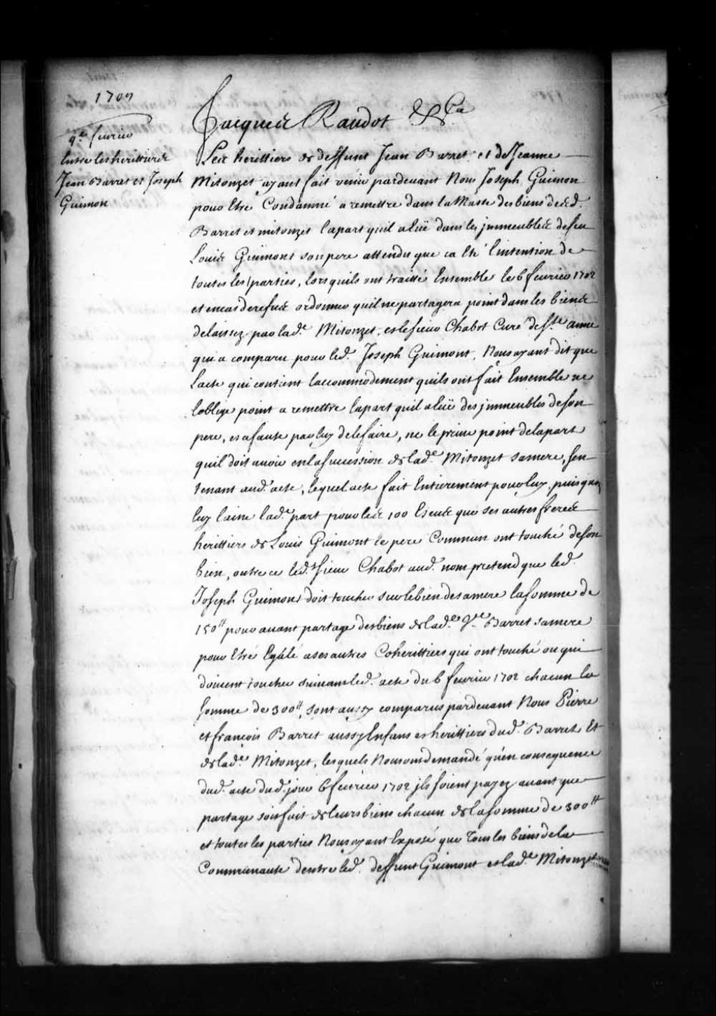 Ordonnance de l'intendant Jacques Raudot qui décide que tous les biens délaissés par Jean Barret (Baret, Barrette, Barrette) et Jeanne Bitouzet (Bitouset), sa femme, seront partagés par moitié dont l'une appartiendra aux enfants Barret pour être partagés également entre eux et l'autre moitié aux enfants de Jeanne Mitouzet, tant du côté de Louis Guimont (Guimond), son premier mari, que du côté dudit Barret, 4 février 1709, Archives nationales à Québec, Fonds Intendants, (03Q,E1,S1,D3,P477).