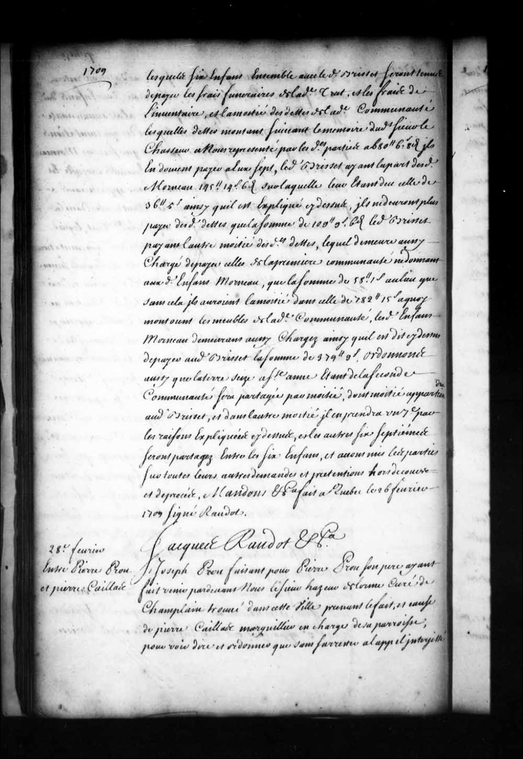 Ordonnance de l'intendant Jacques Raudot entre Pierre Cailla, marguillier en charge de la paroisse de Champlain, et Pierre Proux (Proulx) au sujet du testament de Pierre Proux père, 28 février 1709, Archives nationales à Québec, Fonds Intendants, (03Q,E1,S1,D3,P485).