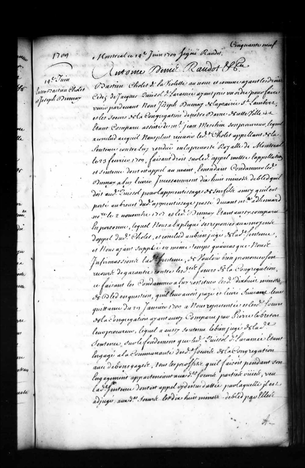 Ordonnance de l'intendant Antoine-Denis Raudot qui met au néant une sentence de la Prévôté de Montréal et condamne Joseph Dumay (Dumais), de la Prairie-Saint-Lambert, à payer et livrer à Bastien Cholet dit Laviolette dix-huit minots de blé, laquelle ordonnance condamne en outre les Soeurs de la Congrégation à rendre et restituer à Joseph Dumay les dix-huit minots de blé qu'elles ont reçus de lui, sauf le recours desdites Soeurs contre Jacques Quissol (Fissiau) dit Laramée