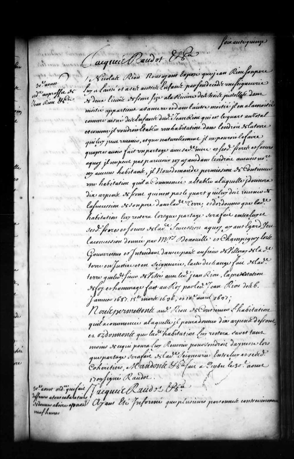 Ordonnance de l'intendant Jacques Raudot qui fait nouvelles défenses aux cabaretiers de Québec de vendre vin, eau-de-vie (alcool) et autres boissons et de donner à boire chez eux après neuf heures du soir sonnées à peine de dix livres d'amende pour la première fois et de pareille amende et de prison pour la seconde, 30 août 1709, Archives nationales à Québec, Fonds Intendants, (03Q,E1,S1,D3,P570).
