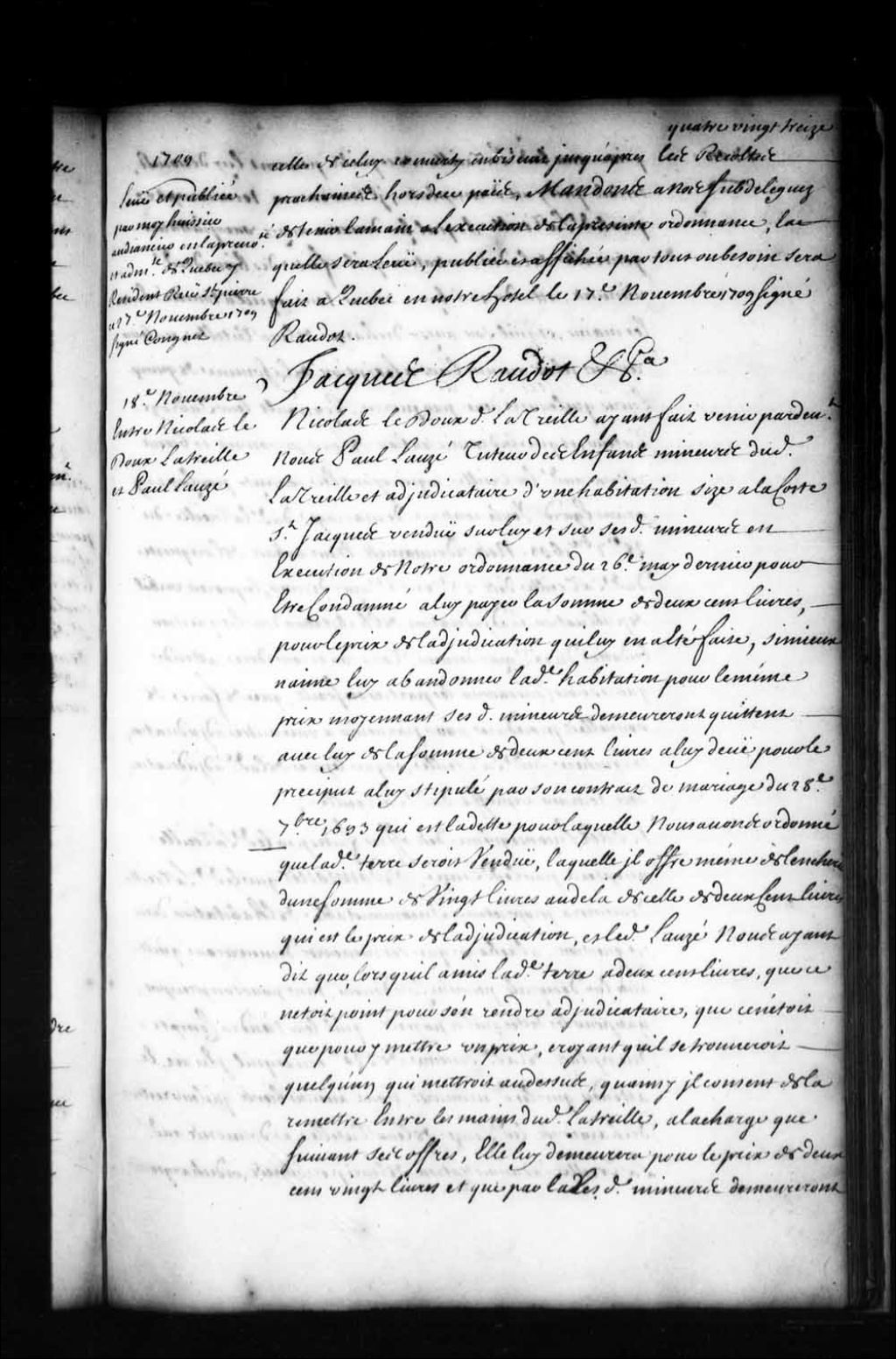 Ordonnance de l'intendant Jacques Raudot entre Nicolas Ledoux dit Latreille et Paul Lauzé au sujet d'une terre située à la côte Saint-Jacques, 18 novembre 1709, Archives nationales à Québec, Fonds Intendants, (03Q,E1,S1,D3,P596).