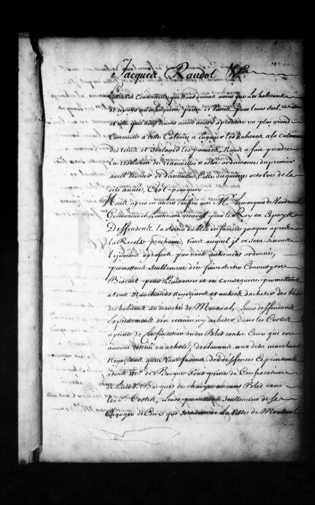 Ordonnance de l'intendant Jacques Raudot qui défend la sortie du blé en farine jusqu'après la récolte prochaine, temps auquel il en sera autrement ordonné, et qui permet seulement d'en faire sortir converti en biscuit pour Plaisance, 1er janvier 1710, Archives nationales à Québec, Fonds Intendants, (03Q,E1,S1,D4,P611).