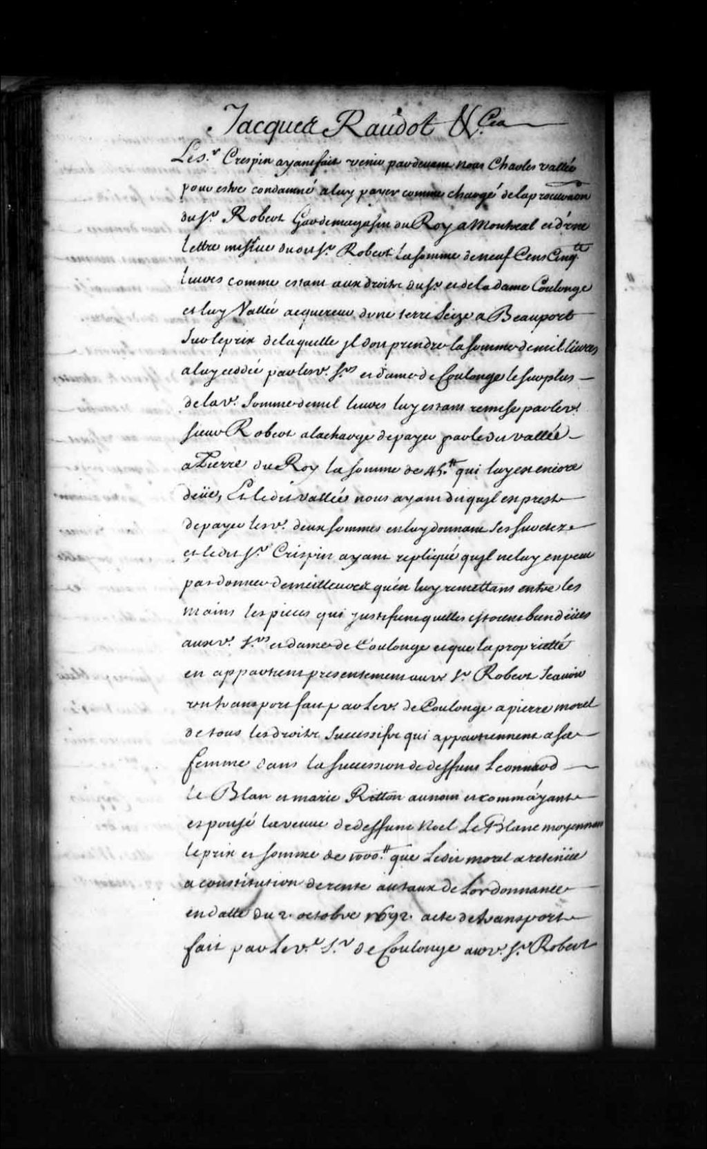 Ordonnance de l'intendant Jacques Raudot entre le sieur Rocbert (de la Morandière), garde-magasin du Roi à Montréal, comme étant aux droits du sieur et de la dame Coulonge (Coulonges), et Charles Vallée, au sujet de la vente d'une terre à Beauport, 30 mars 1710, Archives nationales à Québec, Fonds Intendants, (03Q,E1,S1,D4,P654).