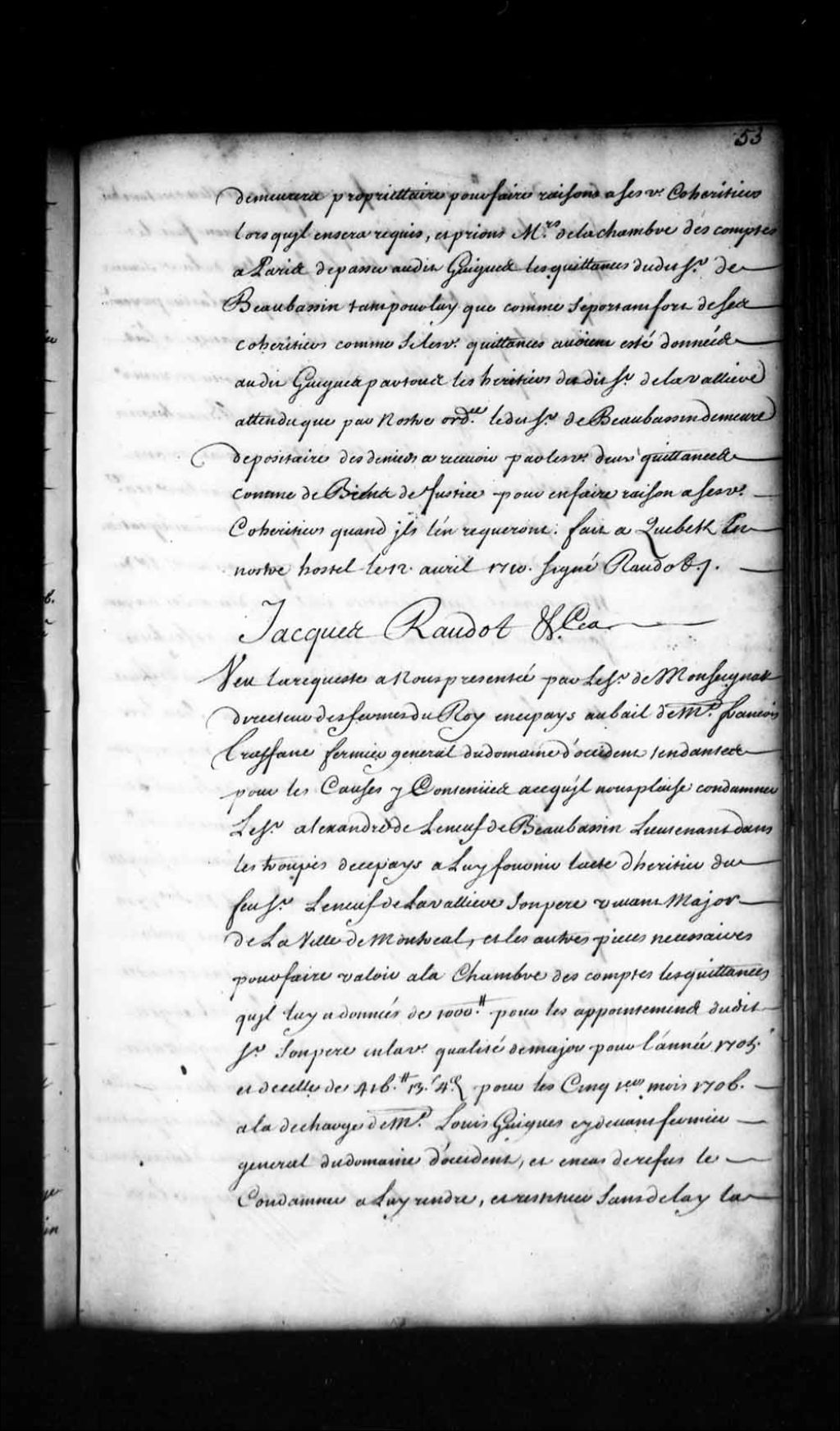 Ordonnance de l'intendant Jacques Raudot qui autorise Alexandre Leneuf de Beaubassin, fils aîné du feu sieur Leneuf de la Vallière (LaVallière), major de Montréal, à donner quittance au sieur de Monseignat, directeur des Fermes du Domaine d'Occident, au nom de ses frères et soeurs, tous absents du pays, à savoir le chevalier de la Vallière (LaVallière), enseigne dans les troupes à Plaisance, île de Terre-Neuve; Judith Leneuf, mariée au sieur de Villieu, de présent en France avec son mari; Marguerite Leneuf, mariée au sieur de Falaise résidant à Port-Royal; Barbe Leneuf, mariée au sieur Aubert du Forillon, de présent en France; Marie-Josèphe Leneuf, épouse du sieur LeGardeur de Saint-Pierre, décédée