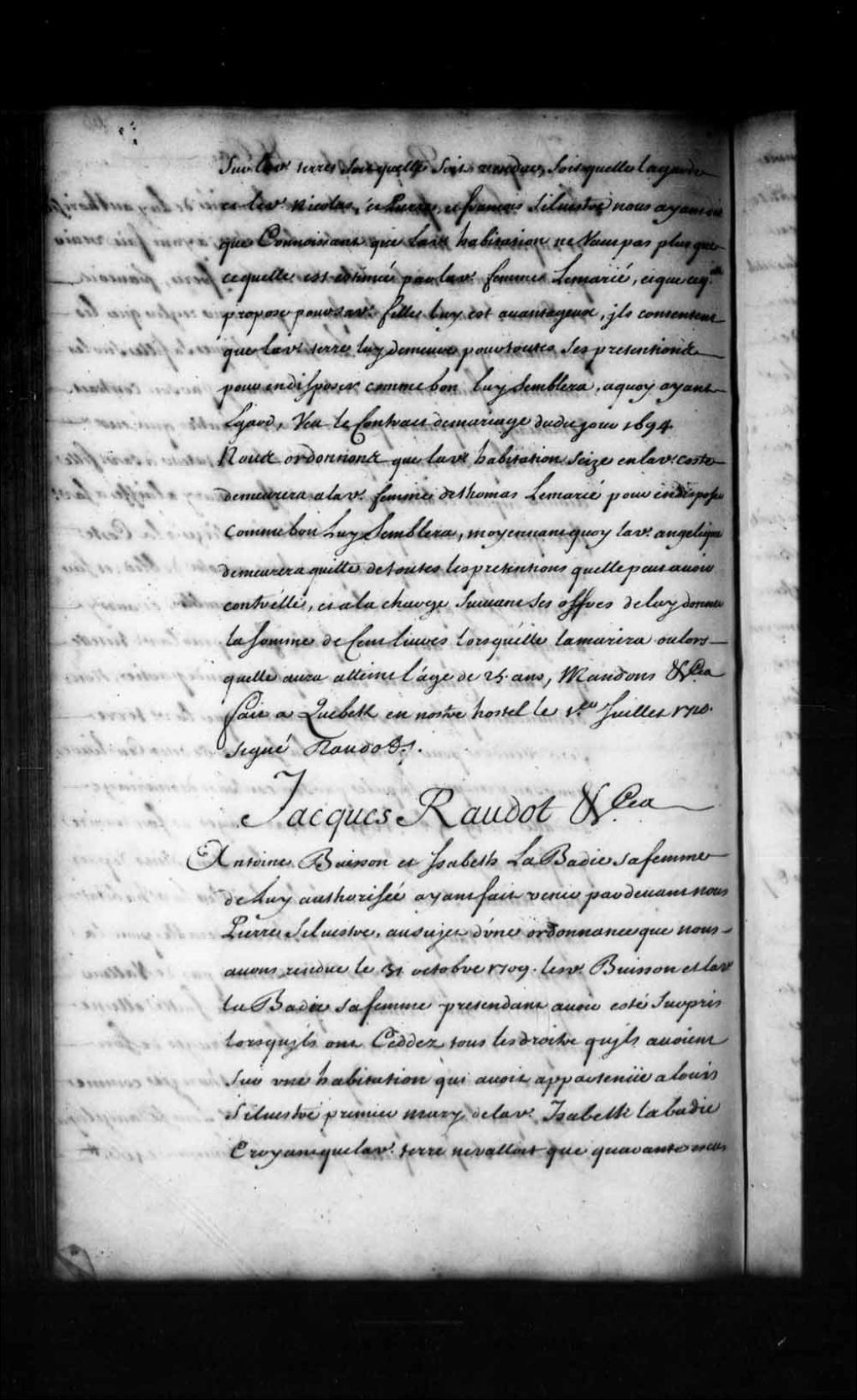 Ordonnance de l'intendant Jacques Raudot entre Antoine Buisson pour Isabelle Labadie, sa femme, et Pierre Sylvestre au sujet d'une terre et maison cédés par une ordonnance sur laquelle ladite Labadie prétend avoir des droits, 1er juillet 1710, Archives nationales à Québec, Fonds Intendants, (03Q,E1,S1,D4,P684).
