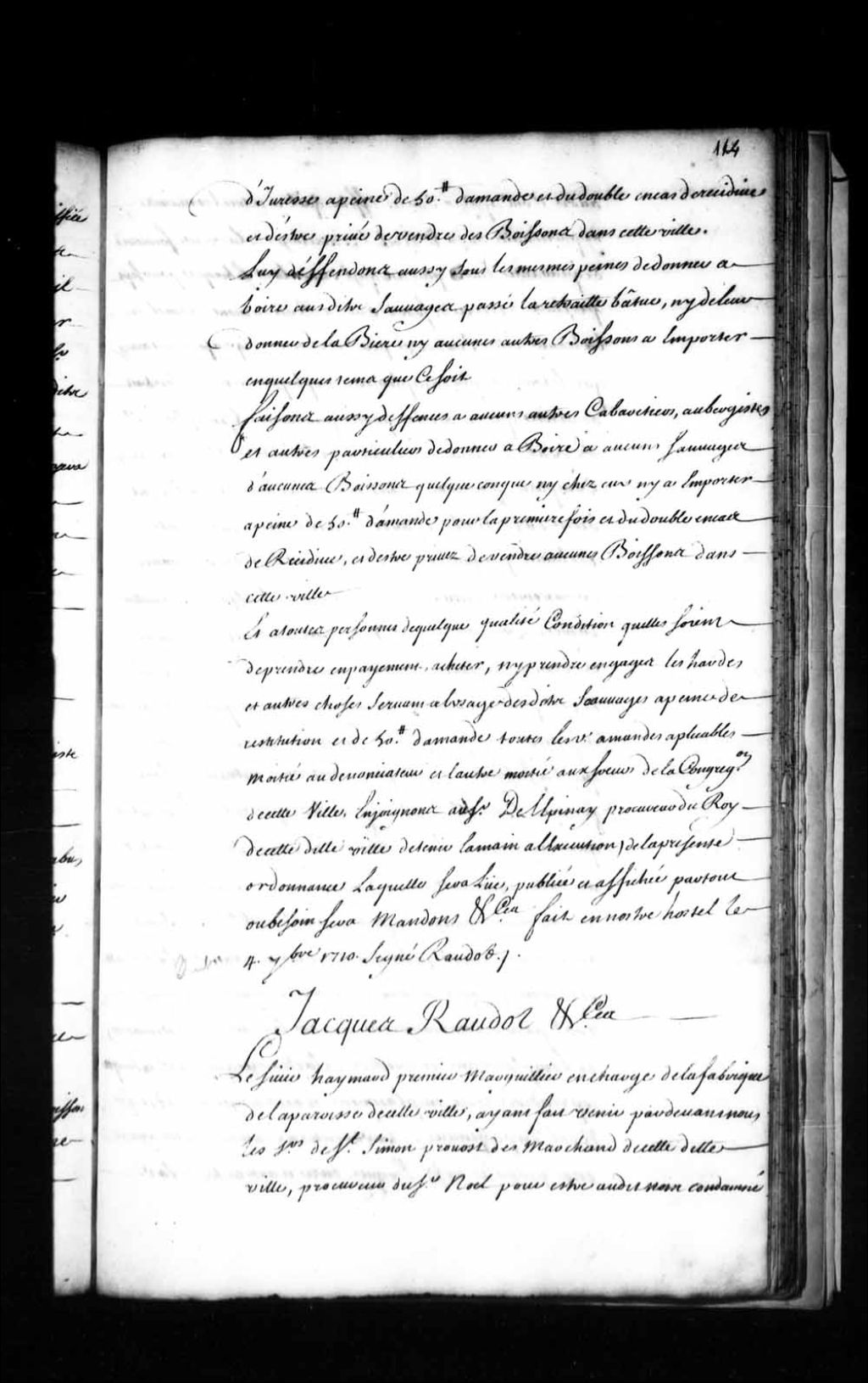Ordonnance de l'intendant Jacques Raudot qui condamne le sieur Noël à payer à la fabrique de la paroisse de Québec les arrérages de rente foncière qu'il lui doit sur un emplacement sis rue Mont-Carmel, à Québec, et qui décide que ladite fabrique reprendra l'emplacement en question à la charge par Noël de payer deux cents livres pour dédommagement, 7 septembre 1710, Archives nationales à Québec, Fonds Intendants, (03Q,E1,S1,D4,P739).