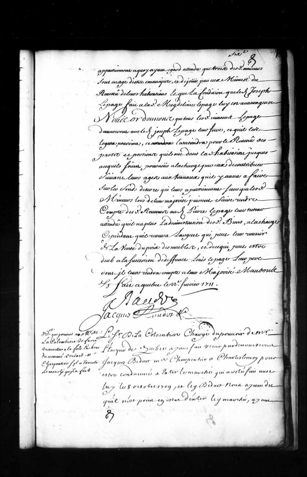 Ordonnance de l'intendant Jacques Raudot qui permet au sieur de la Colombière (LaColombière), chargé du pouvoir de Monseigneur l'évêque de Québec, de faire exécuter aux dépens de Jacques Bédard, maître charpentier de Charlesbourg, les travaux de construction des deux ailes de l'Hôpital général de Québec que ledit Bédard s'était engagé à construire par contrat du 8 octobre 1709, 19 février 1711, Archives nationales à Québec, Fonds Intendants, (03Q,E1,S1,D5,P764).