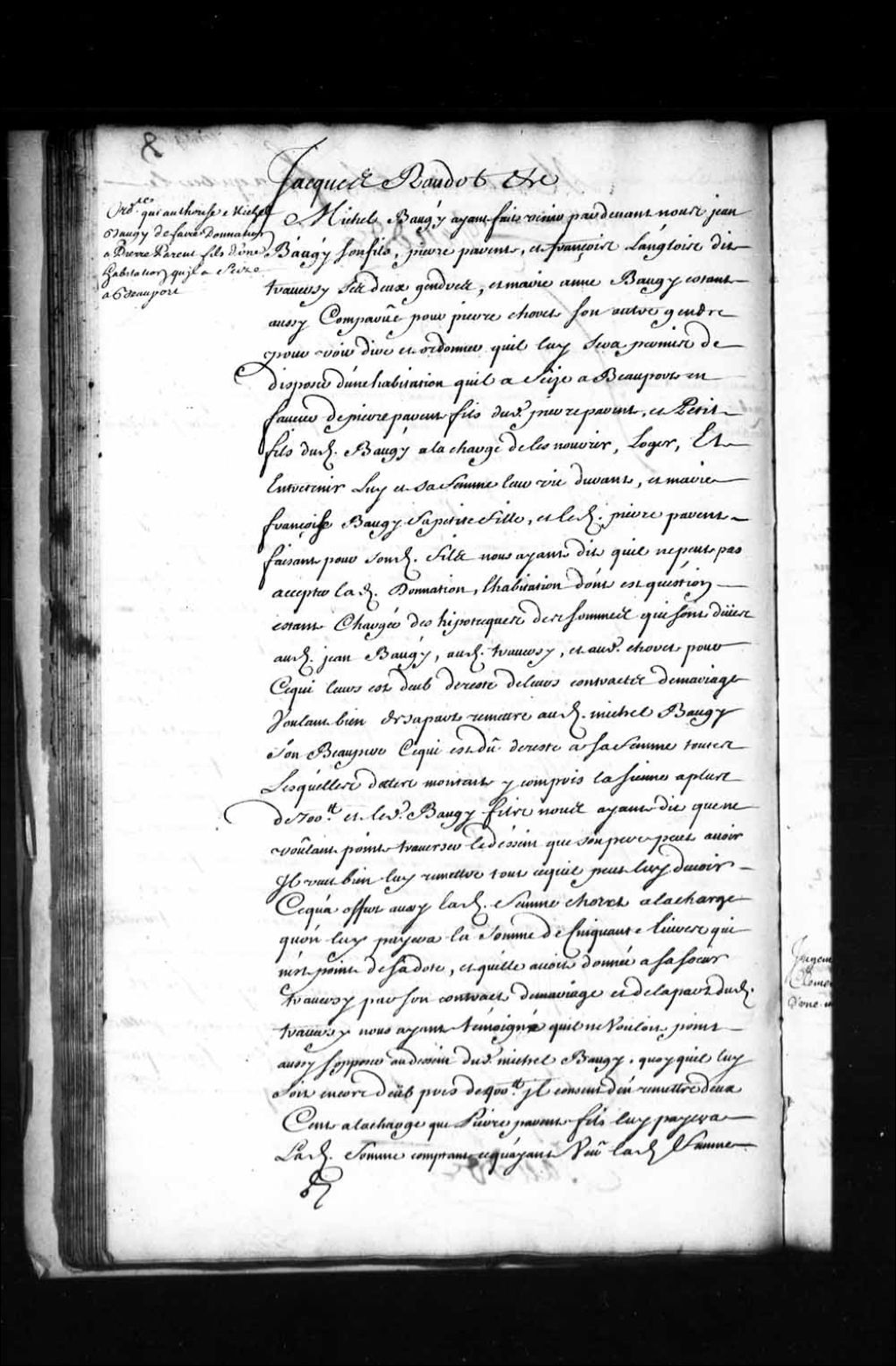 Ordonnance de l'intendant Jacques Raudot qui permet à Michel Baugy (Baugis), habitant de Beauport, de donner sa terre à son petit-fils Pierre Parent fils, à la charge de le nourrir et entretenir, lui et sa femme, Madeleine Dubois, leur vie durant, et de certaines autres conditions