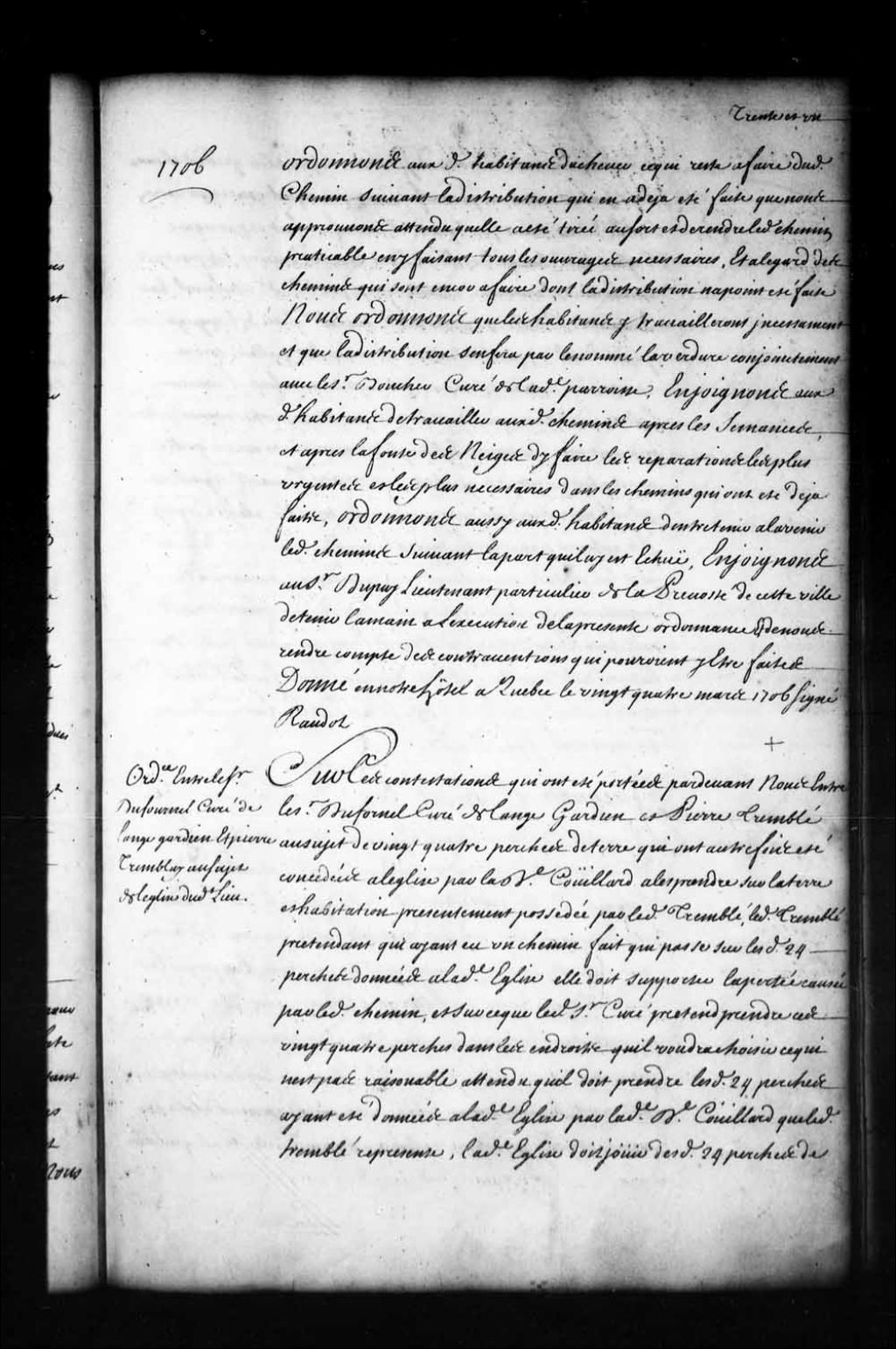 Ordonnance de l'intendant Jacques Raudot entre le sieur Dufornel (Dufournel), curé de L'Ange-Gardien, d'une part, et Pierre Tremblay, d'autre part, au sujet de 24 perches de terre concédées à l'église et à la fabrique de L'Ange-Gardien par la veuve Couillard