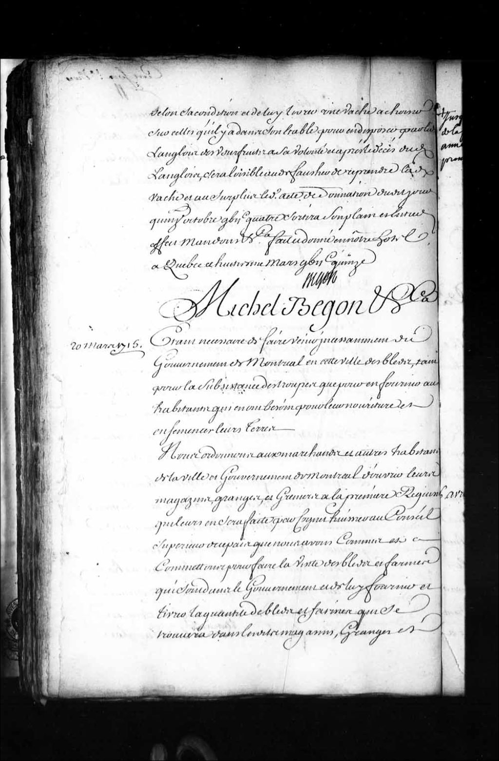 Ordonnance de l'intendant Bégon qui commet Jean Congnet (Cognet, Coignet), huissier au Conseil supérieur de Québec, pour faire la visite des blés et farines qui sont dans le gouvernement de Montréal et qui porte ordre aux marchands et autres d'ouvrir magasins, granges et greniers à la première requête qui leur en sera faite par ledit Congnet, 20 mars 1715, Archives nationales à Québec, Fonds Intendants, (03Q,E1,S1,D6,P970).