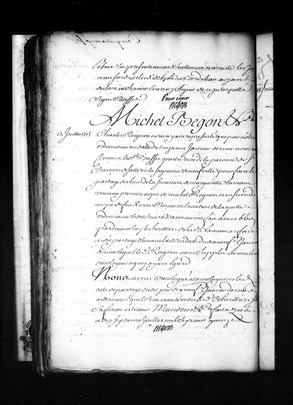 Ordonnance de l'intendant Bégon qui homologue le partage fait en vertu d'une ordonnance du 13 janvier 1715 par le sieur Basset, curé de Saint-François-de-Sales de la Pointe-aux-Trembles, d'une terre dépendante de la succession de Michel Rognon (Roignon)