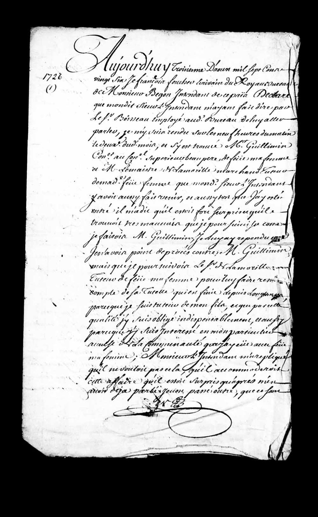 Protestation faite par François Fouché (Foucher, Fouchet), à l'intérieur de son testament olographe, contre les conséquences du refus par l'intendant Michel Bégon d'autoriser sa poursuite contre le sieur Lemaître de Lamorille, tuteur des biens de la veuve dudit Foucher, 3 août 1726, Archives nationales à Québec, Fonds Intendants, (03Q,E1,S2,P12).