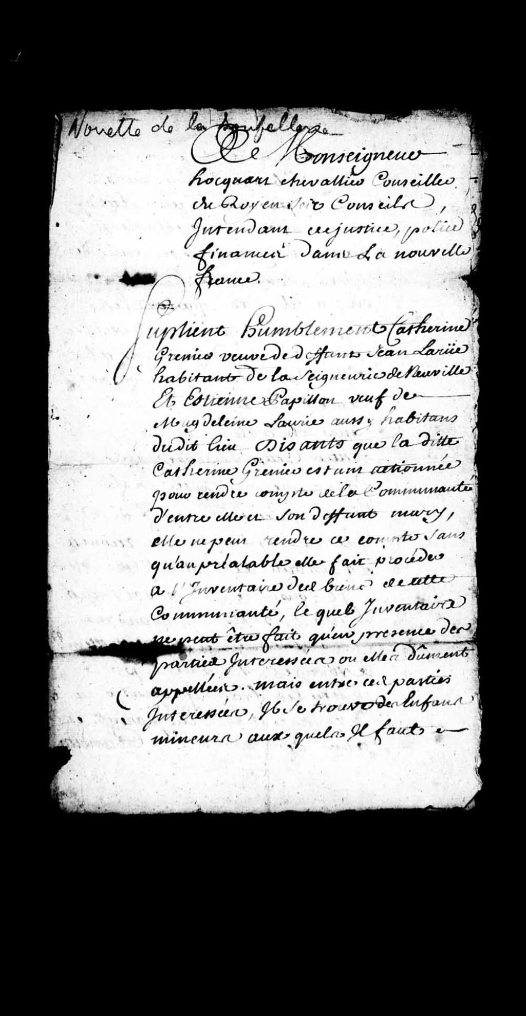 Ordonnance de l'intendant Gilles Hocquart acceptant que le notaire Pillard, de Neuville, procède à l'élection d'un tuteur et d'un subrogé-tuteur pour les enfants mineurs de la veuve Catherine Grenier et du veuf Étienne Pappilon (Papillon), en réponse à la requête de ladite veuve Grenier et dudit veuf Pappilon demandant qu'un tuteur et un subrogé-tuteur soit élu pour leurs enfants mineurs par ledit notaire Pillard