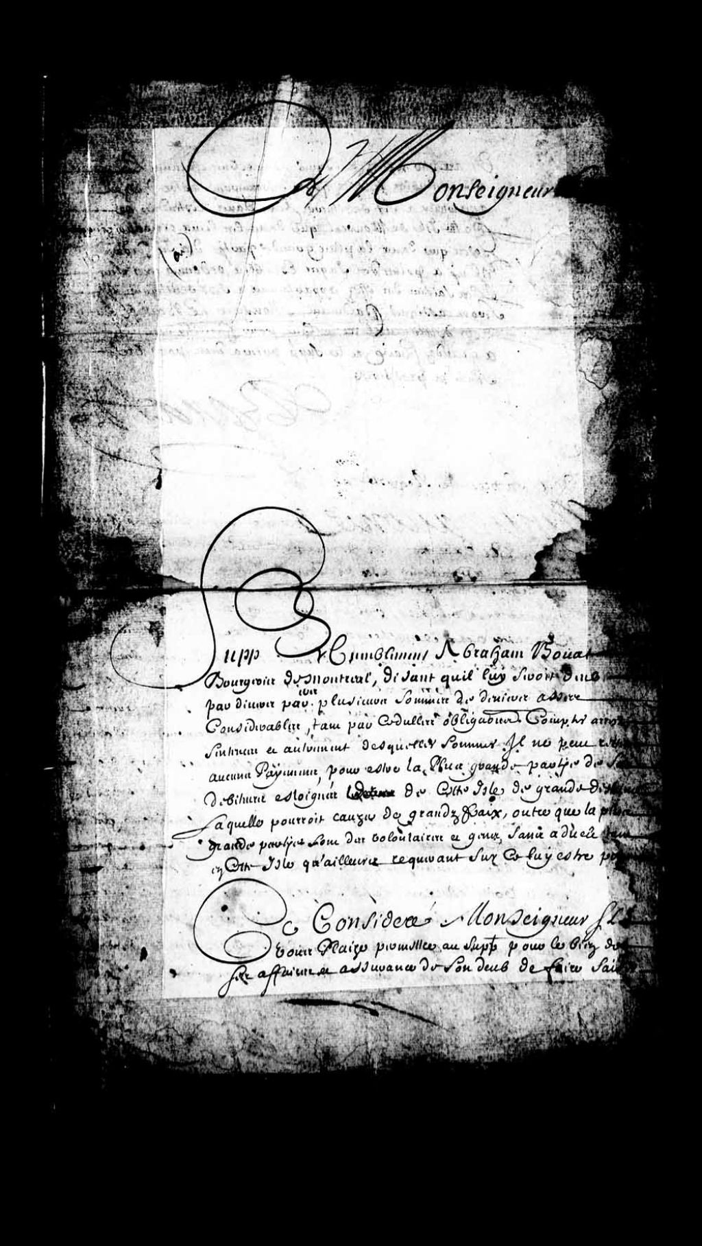 Ordonnance de l'intendant Jacques Duchesneau permettant à Abraham Bouat, bourgeois de Montréal, de faire certaines saisies, en réponse à la requête dudit Abraham Bouat, lequel se plaignant de ne pouvoir être payé par ses débiteurs éloignés, volontaires et sans aveu, que par saisies, 13 juin 1680, Archives nationales à Québec, Fonds Intendants, (03Q,E1,S2,P2).