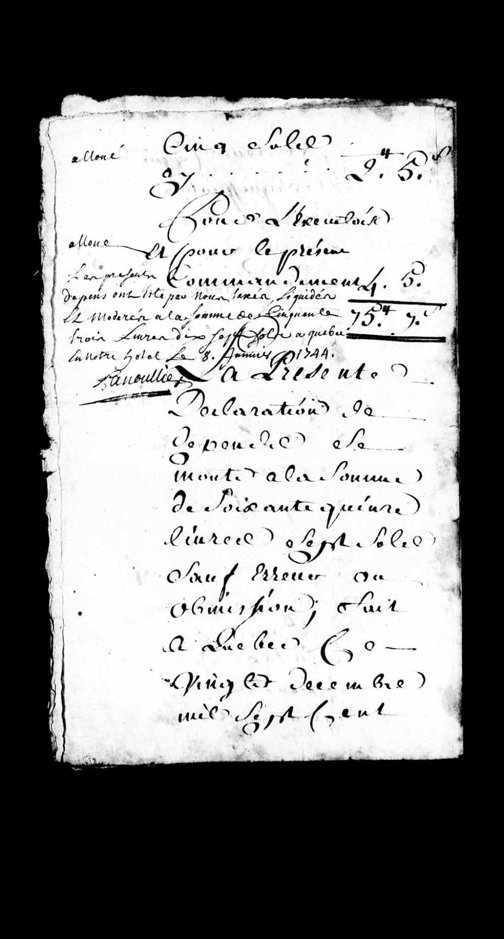 Déclaration de dépens auxquels le sieur Charly, négociant de Montréal, a été condamné par le sieur Lanouiller (Lanoullier), conseiller au Conseil supérieur de Québec, dans la cause impliquant Geneviève Charest (Charet), 8 janvier 1744, Archives nationales à Québec, Fonds Intendants, (03Q,E1,S2,P21).
