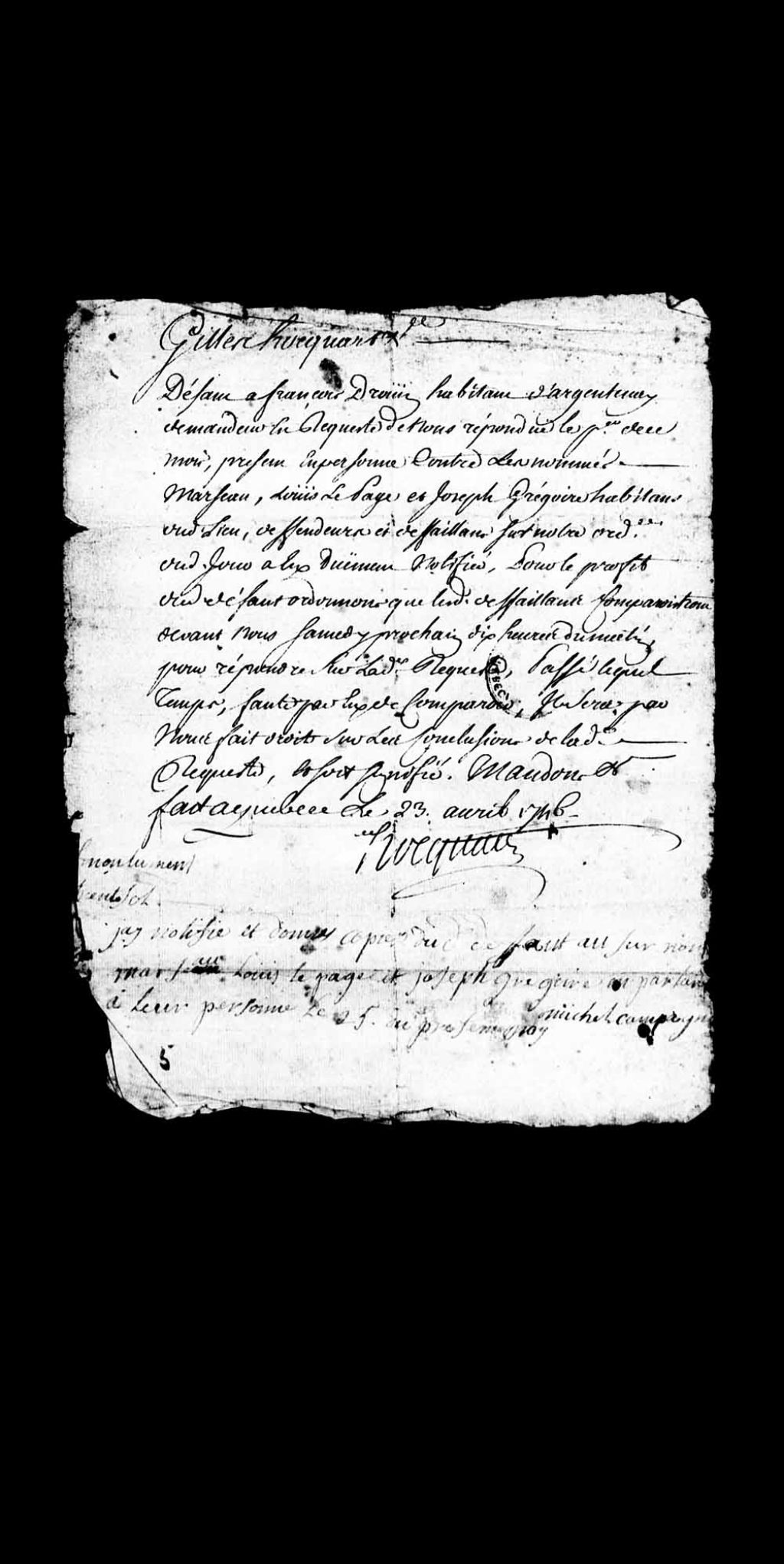 Ordonnance de l'intendant Gilles Hocquart enjoignant à comparaître le nommé Marseau (Marceau), Louis Lepage et Joseph Grégoire, habitants d'Argentenay, en réponse à la requête de François Drouin, aussi d'Argentenay, contre lesdits Marseau, Lepage et Grégoire, à défaut de quoi la requête dudit François Drouin sera accordée