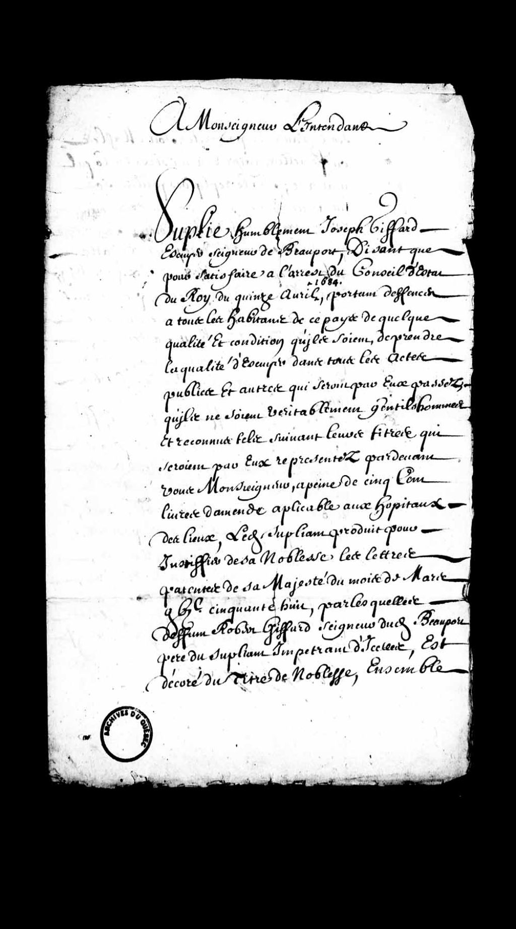 Requête de Joseph Giffard, seigneur de Beauport, à l'intendant Jacques de Meulles pour qu'il lui soit permis de prendre le titre d'écuyer vu les lettres de noblesse accordées à feu Robert Giffard les 8 septembre 1658 et 6 juin 1659, 15 avril 1684 - 31 décembre 1684, Archives nationales à Québec, Fonds Intendants, (03Q,E1,S2,P3).