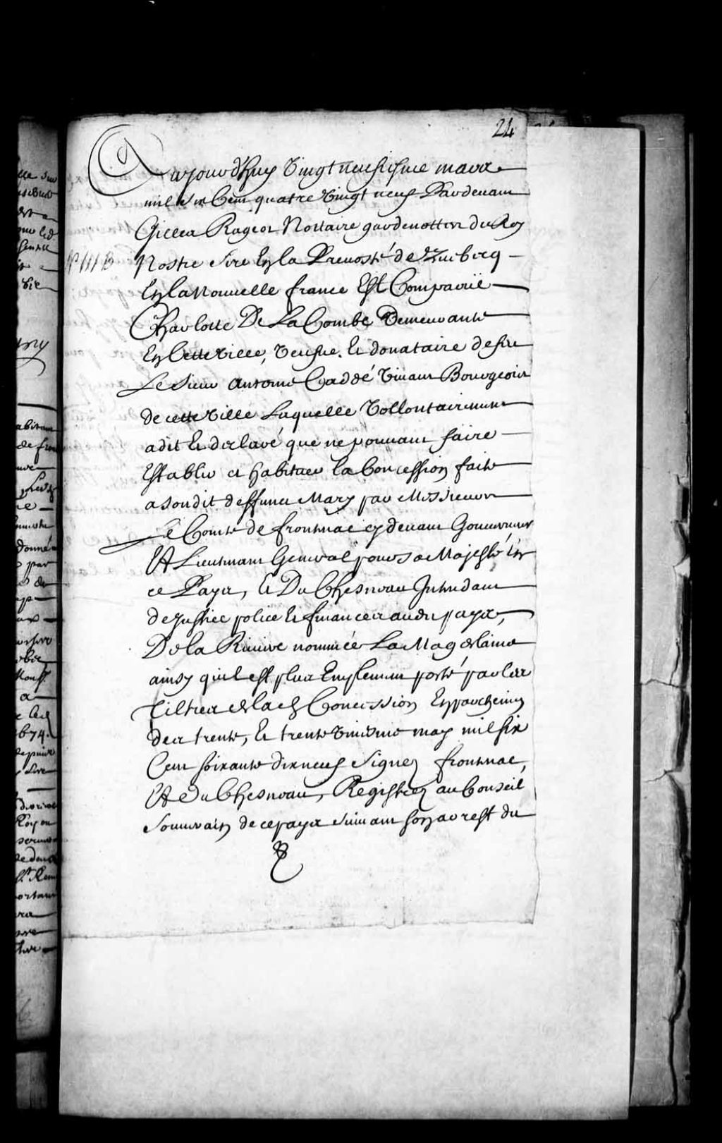 Déclaration de Charlotte de LaCombe (de La Combe), veuve et donataire de feu Antoine Caddé quant à l'abandon de la concession de la Rivière-de-la-Madeleine, octroyée à son défunt mari le 31 mai 1679 par les sieurs Comte de Frontenac et Duchesneau, gouverneur et intendant de la Nouvelle-France, à défaut de pouvoir faire établir et habiter ladite concession (Notaire Gilles Rageot)