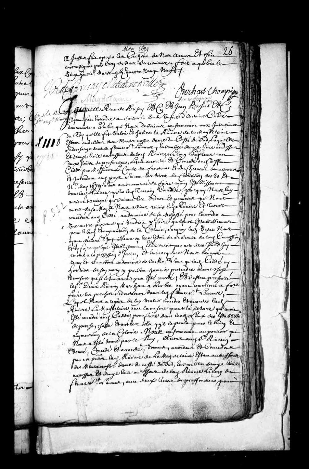 Acte de concession par Jacques-René de Brisay, Marquis de Denonville, et Jean Bochart Champigny, gouverneur et intendant de la Nouvelle-France, au sieur Denis Riverin, marchand de Québec, de la rivière de la Madeleine, au-dessous des Monts Notre-Dame, du côté du sud, laquelle se décharge dans le fleuve Saint-Laurent, laquelle concession comprenant une demi-lieue au-dessus et au-dessous de ladite rivière, le long dudit fleuve, avec deux lieues de profondeur, suite à la réunion de ladite étendue au Domaine de sa Majesté, laquelle ayant d'abord été accordée les 30 et 31 mai 1679 par messires de Frontenac et Duchesneau, gouverneur et intendant de la Nouvelle-France, au sieur Antoine Caddé, le tout à titre de fief et seigneurie