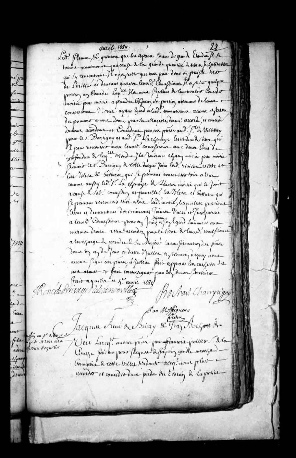 Acte de concession par Jacques-René de Brisay, Marquis de Denonville, et Jean Bochart Chambly, gouverneur et intendant de la Nouvelle-France, à François Poisset, sieur de la Conche (LaConche) pour Jacques Defaye (de Faye), son gendre, de deux pieds sur le terrain de la petite ruelle qui est le long de l'emplacement appartenant audit sieur Defaye (de Faye), derrière sa maison, sise rue Notre-Dame en la Basse-Ville de Québec