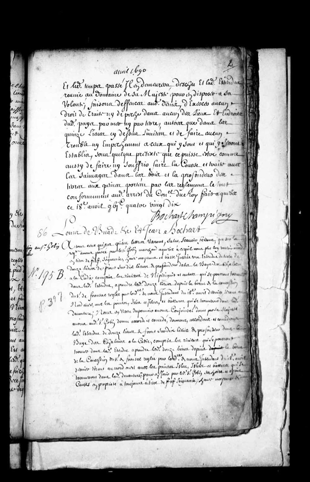 Acte de concession par Louis de Buade, Comte de Frontenac, et Jean Bochart Champigny, gouverneur et intendant de la Nouvelle-France, au sieur Gobin, marchand de Québec, de l'étendue de douze lieues de terre de front sur dix lieues de profondeur dans la baie des Chaleurs à l'Acadie, à prendre depuis la borne de la concession du sieur de Fronsac réglée par l'ordonnance du 18 avril 1690 dudit intendant Jean Bochart Champigny, laquelle concession comprenant en outre les rivières avec les pointes, îles, îlets et battures qui se trouveraient dans ladite étendue et ladite devanture, à titre de fief et seigneurie avec haute, moyenne et basse justice, 26 mai 1690, Archives nationales à Québec, Fonds Intendants, (03Q,E1,S3,P125).