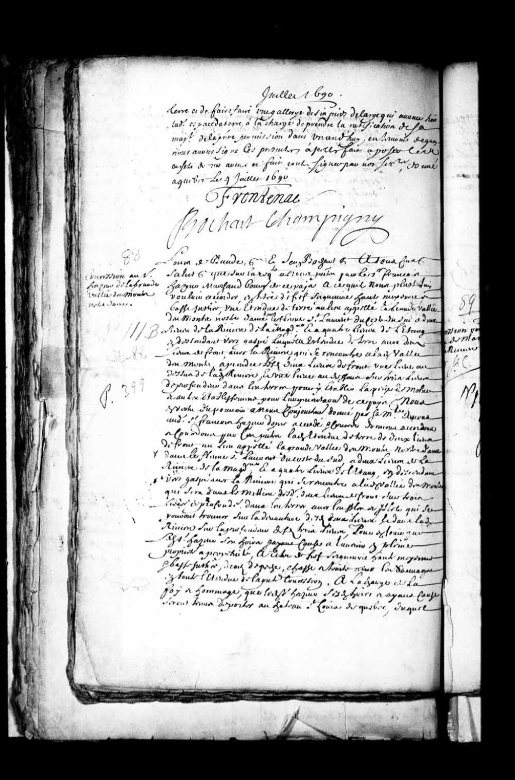 Acte de concession par Louis de Buade, Comte de Frontenac, et Jean Bochart Champigny, gouverneur et intendant de la Nouvelle-France, au sieur François Hazeur, marchand bourgeois de la Nouvelle-France, de l'étendue de terre de deux lieues de front appelée la Grande-Vallée des monts Notre-Dame, sur le côté sud du fleuve Saint-Laurent, à deux lieues de la rivière de la Madeleine et à quatre lieues de l'étang en descendant vers Gaspé, avec la rivière qui se rencontre à ladite vallée des Monts dans le milieu desdites deux lieues de front, sur trois lieues de profondeur dans les terres, avec les îles et îlets sur la devanture desdites deux lieues et dans ladite rivière sur la profondeur desdites trois lieue, à titre de fief et seigneurie avec haute, moyenne et basse justice