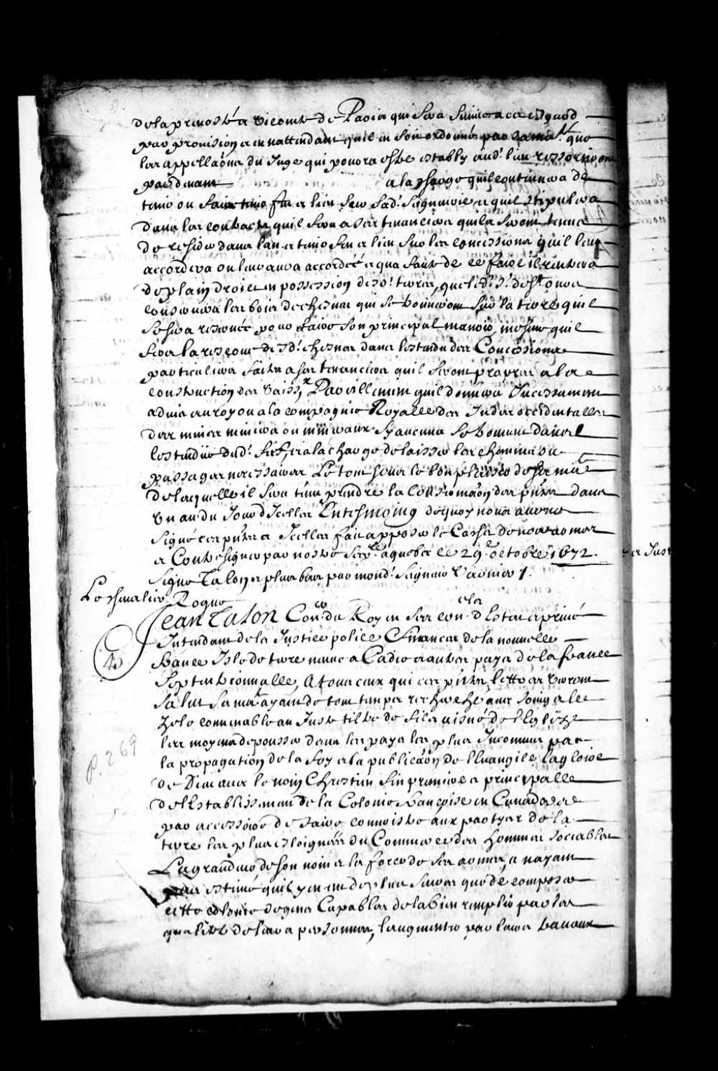 Acte de concession par Jean Talon, intendant de la Nouvelle-France, au chevalier Roque, enseigne de la compagnie de Chambly au régiment de Carignan, de la quantité de quatre lieues de terre de front sur une lieue de profondeur à prendre sur la rivière Saint-Louis, à savoir deux lieues au nord de ladite rivière, soit une lieue au-dessus du fort Saint-Louis, et deux lieues au sud vis-à-vis lesdites deux lieues du nord, à titre de fief, seigneurie et justice, 29 octobre 1672, Archives nationales à Québec, Fonds Intendants, (03Q,E1,S3,P14).