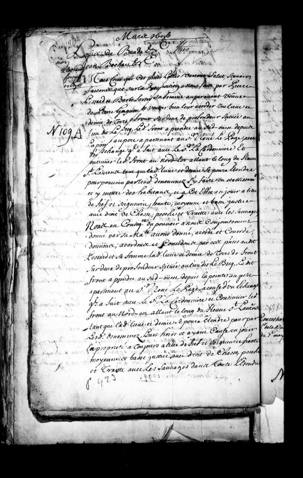 Acte de concession par Louis de Buade, Comte de Frontenac, et Jean Bochart Champigny, gouverneur et intendant de la Nouvelle-France, à Pierre Lessard et Barbe Fortin, sa femme, auparavant veuve de Pierre Gagnon, d'une lieue et demie de terre de front sur deux de profondeur au lieu dit le Bic, à prendre au sud-ouest depuis la Pointe-aux-Pères appartenant au sieur René Lepage à cause d'un échange qu'il a fait avec le sieur de la Cardonnière (LaCardonnière) et au nord-est en allant le long du fleuve Saint-Laurent tant que ladite lieue et demie s'étendra, à titre de fief et seigneurie avec haute, moyenne et basse justice