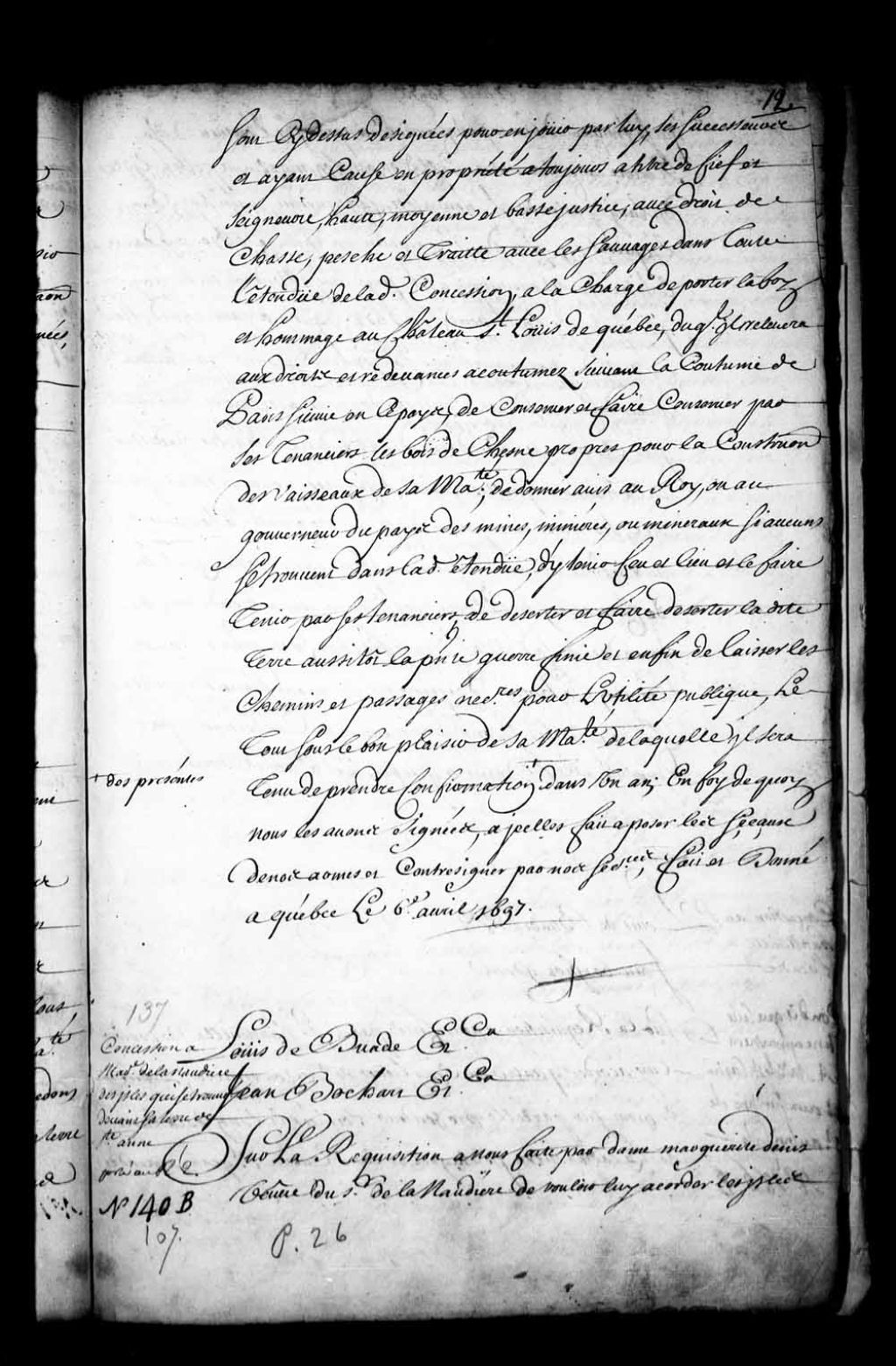Acte de concession par Louis de Buade, Comte de Frontenac, et Jean Bochart Champigny, gouverneur et intendant de la Nouvelle-France, à Marguerite Denys (Denis), veuve du sieur de Lanaudière, des îles se trouvant devant sa terre de Sainte-Anne et à l'entrée de sa rivière, avec entre autres celle où est son moulin, appelée l'île du Large, attendu qu'il n'en a été fait aucune mention dans l'acquisition faite du sieur Amelin (Hamelin) en l'année 1670 ni dans le titre émis par le sieur Talon, alors intendant en ce pays, autorisant ladite vente en 1672, ladite concession étant faite aux mêmes droits et charges portés au titre de concession de sa terre de Sainte-Anne et à condition de prendre ratification des présentes de Sa Majesté d'ici un an
