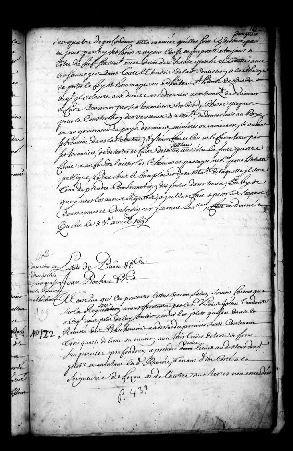 Acte de concession par Louis de Buade, Comte de Frontenac, et Jean Bochart Champigny, gouverneur et intendant de la Nouvelle-France, à Louis Jolliet des îlets qui sont dans la rivière des Etchemins, au-dessus du premier saut, contenant trois quarts de lieue ou environ avec trois lieues de terre de front sur pareille profondeur, à prendre à une demi-lieue au-dessous desdits îlets en montant ladite rivière, tenant d'un côté à la seigneurie de Lauzon et de l'autre aux terres non concédées, à titre de fief et seigneurie avec haute, moyenne et basse justice