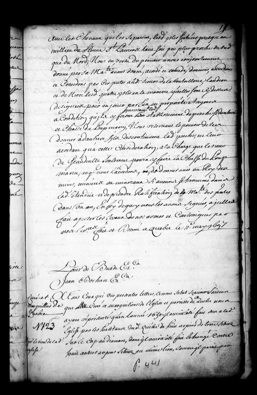 Acte de concession par Louis de Buade, Comte de Frontenac, et Jean Bochart Champigny, gouverneur et intendant de la Nouvelle-France, aux curé et marguilliers de l'église et paroisse de Québec de huit arpents de terre situés au Cap aux Diamants à Québec, à titre de fief seulement, lesdits curé et marguilliers ayant représenté qu'en l'année 1650, il aurait été fait don à ladite église par les habitants de Québec de huit arpents situés au Cap aux Diamants et dont il aurait été fait échange pour le bien de ladite église contre huit autres arpents situés au même lieu, comme il paraît par le titre d'échange qui lui en a été accordé par le sieur de Lauzon, alors gouverneur et lieutenant général pour le Roi en ce pays, desquels huit arpents de terre il aurait été pris un demi-arpent ou environ pour l'agrandissement du jardin du château de Québec et que les fortifications de ladite ville coupent et traversent entièrement le reste dudit terrain, 15 mai 1697, Archives nationales à Québec, Fonds Intendants, (03Q,E1,S3,P201).