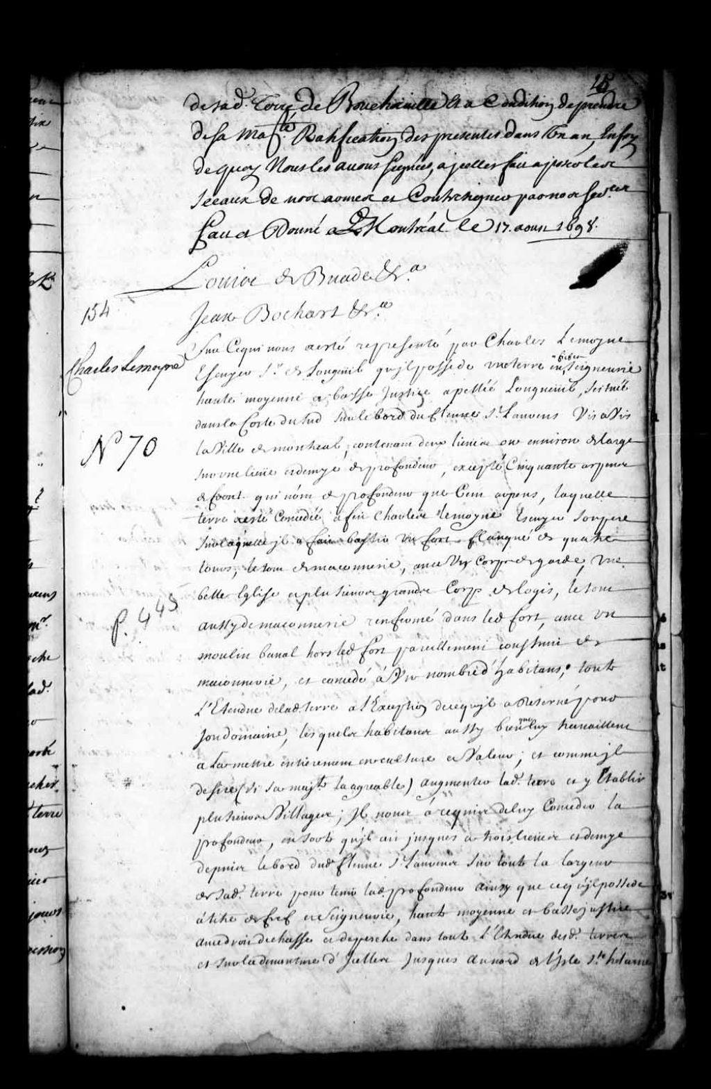 Acte de concession par Louis de Buade, Comte de Frontenac, et Jean Bochart Champigny, gouverneur et intendant de la Nouvelle-France, à Charles Lemoyne (Lemoine), écuyer, sieur de Longueuil, de la profondeur située derrière la terre et seigneurie de Longueuil, lui appartenant, pour s'étendre à l'avenir jusqu'à trois lieues et demie du bord du fleuve Saint-Laurent sur toute la largueur de ladite terre avec les droits de chasse et de pêche dans toute ladite étendue, et au-devant jusqu'au nord de l'île Sainte-Hélène, à titre de fief et seigneurie avec haute, moyenne et basse justice