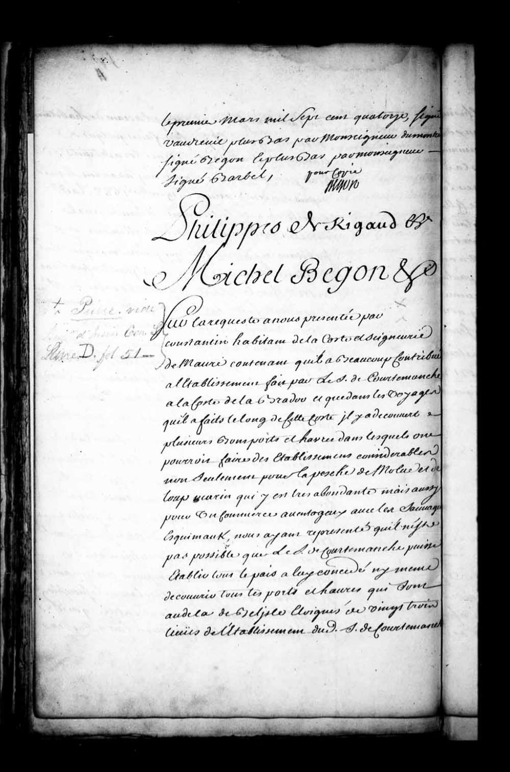 Acte de concession par Philippe de Rigaud, Marquis de Vaudreuil, et Michel Bégon, gouverneur et intendant de la Nouvelle-France, au sieur Pierre Constantin de trente lieues de terre de front depuis le détroit de Belle-Isle en descendant au nord-nord-est sur les dix lieues de profondeur avec les îles et battures se trouvant sur ladite étendue, pour qu'il puisse en jouir pendant dix années avec droits de chasse, de pêche et de traite avec les Sauvages (Amérindiens) sur toute l'étendue de la concession