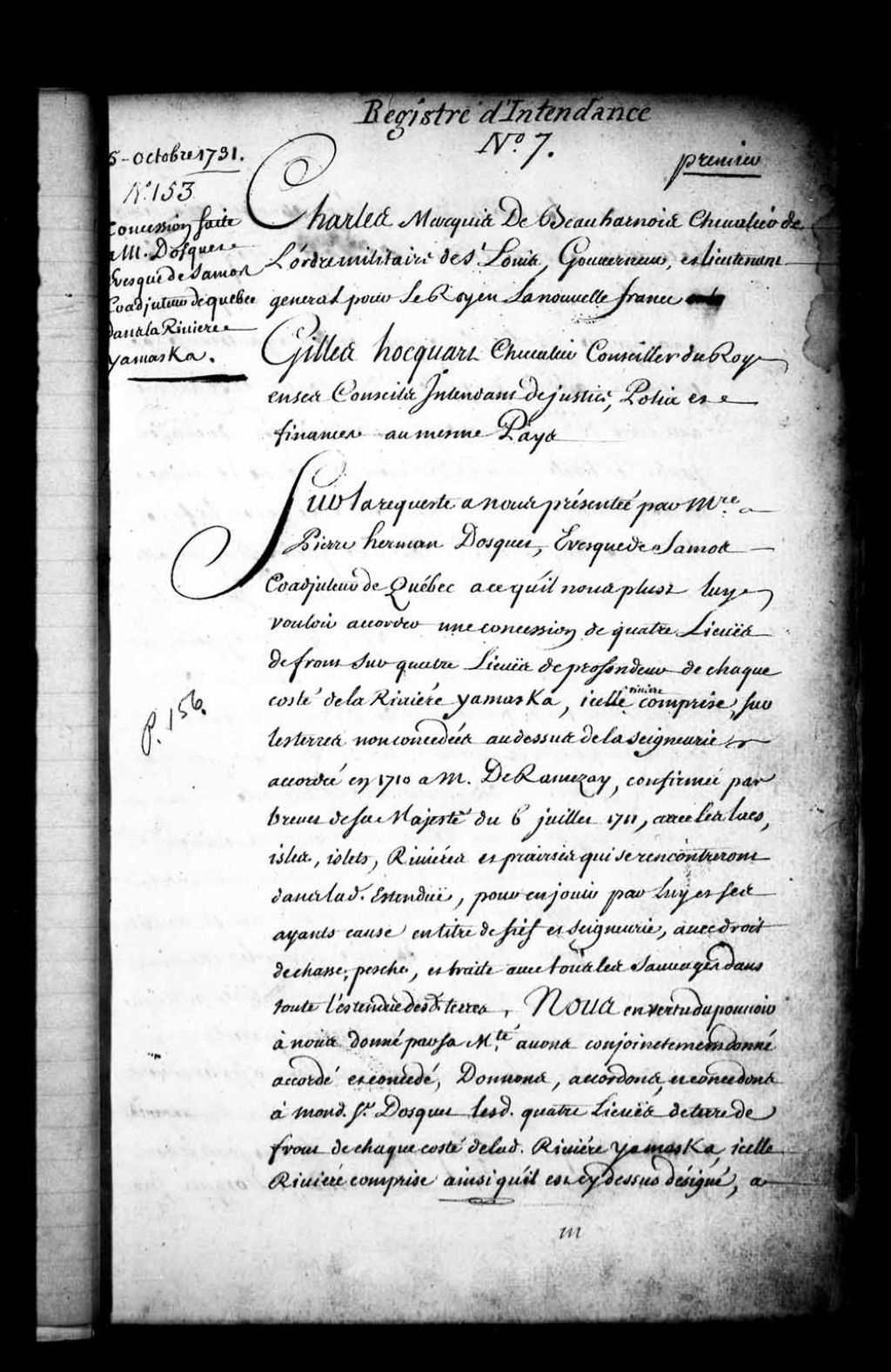 Acte de concession par Charles de Boische, Marquis de Beauharnois, et Gilles Hocquart, gouverneur et intendant de la Nouvelle-France, au sieur Pierre-Hermann Dosquet, évêque de Samos, coadjuteur de Québec, de quatre lieues de terre de front de chaque côté de la rivière Yamaska, celle-ci étant comprise dans les limites de la concession, lesquelles lieues à prendre dans les terres non concédées au-dessus de la concession accordée en 1710 au sieur de Ramezay, laquelle concession comprenant en outre les îles, îlets, lacs, rivières et prairies s'y trouvant, à titre de fief et seigneurie avec haute, moyenne et basse justice