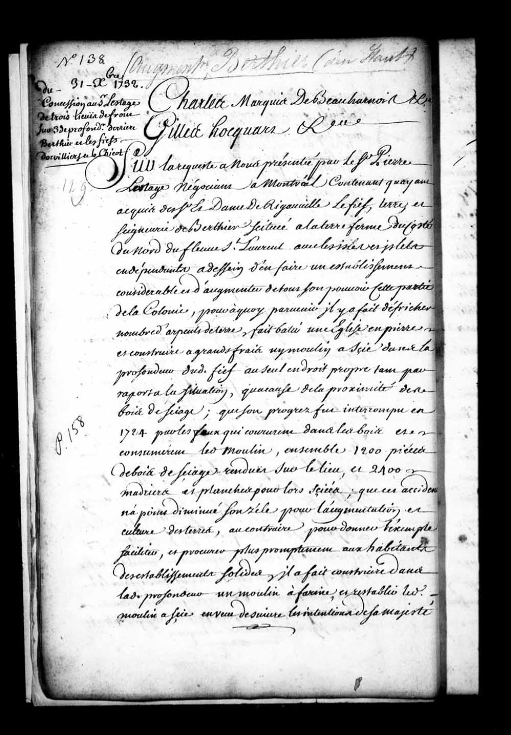 Acte de concession par Charles de Boische, Marquis de Beauharnois, et Gilles Hocquart, gouverneur et intendant de la Nouvelle-France, au sieur Pierre de Lestage, négociant de Montréal, de trois lieues de terre de front, si telle quantité se trouve entre la ligne qui sépare le fief Dautré (Dautray, d'Autray) d'avec celui auparavant nommé de Comporté, et à présent nommé Dorvilliers (d'Orvilliers) et celle qui sépare le fief du Chicot d'avec le fief de Maskinongé, ledit front étant à prendre au bout de la profondeur desdits fiefs Dorvilliers et du Chicot entre lesquels se trouve ledit fief de Berthier, sur trois lieues de profondeur, avec les rivières, ruisseaux et lacs se rencontrant dans ladite étendue de terre, ladite augmentation devant être unie et jointe au fief de Berthier et ne faire ensemble qu'une seule et même seigneurie avec lui, à titre de fief et seigneurie avec haute, moyenne et basse justice