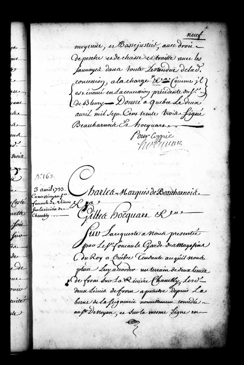 Acte de concession par Charles de Boische, Marquis de Beauharnois, et Gilles Hocquart, gouverneur et intendant de la Nouvelle-France, au sieur Foucault, garde des magasins du Roi à Québec, de l'étendue de deux lieues de front sur la rivière Chambly (Richelieu), à prendre depuis la borne de la seigneurie nouvellement concédée au sieur de Noyan, et sur la même ligne en remontant le long de ladite rivière Chambly, sur la profondeur se trouvant jusqu'à la baie de Missisquoi, laquelle étendue étant bornée au nord par la seigneurie dudit sieur Noyan sur la même ligne, sur le devant par la rivière Chambly et sur la profondeur par la baie de Missisquoi, à titre de fief et seigneurie avec haute, moyenne et basse justice