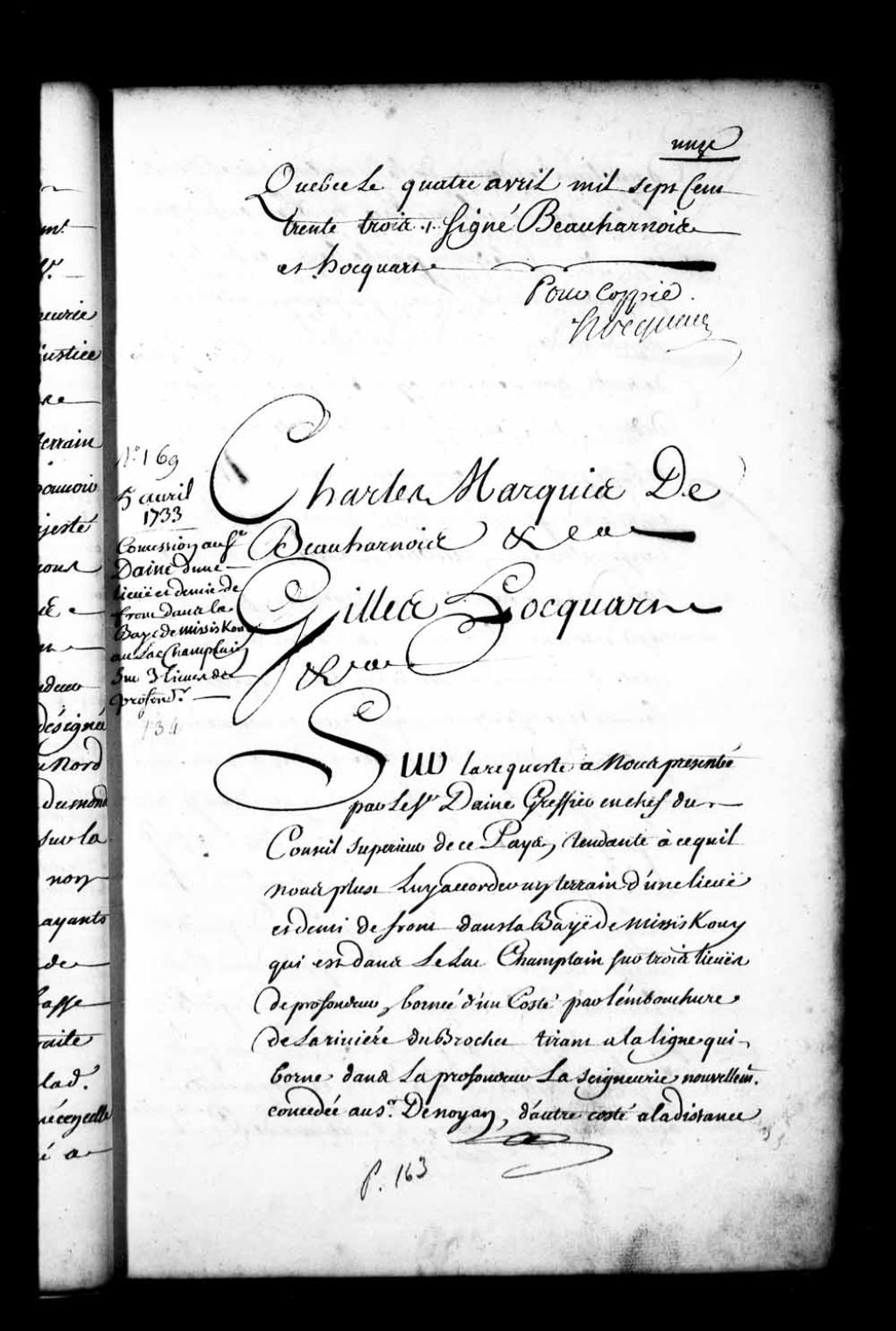 Acte de concession par Charles de Boische, Marquis de Beauharnois, et Gilles Hocquart, gouverneur et intendant de la Nouvelle-France, au sieur Daine, greffier en chef du Conseil supérieur de ce pays, de l'étendue d'une lieue et demie de front dans la baie de Missisquoi dans le lac Champlain, sur trois lieues de profondeur, laquelle étendue étant bornée d'un côté par l'embouchure de la rivière du Brochet, tirant à la ligne qui borne dans la profondeur la seigneurie nouvellement concédée au sieur de Noyan, sur le devant par la baie et sur la profondeur à trois lieues joignant les terres non concédées, laquelle concession étant nommée Boisfranc, à titre de fief et seigneurie avec haute, moyenne et basse justice