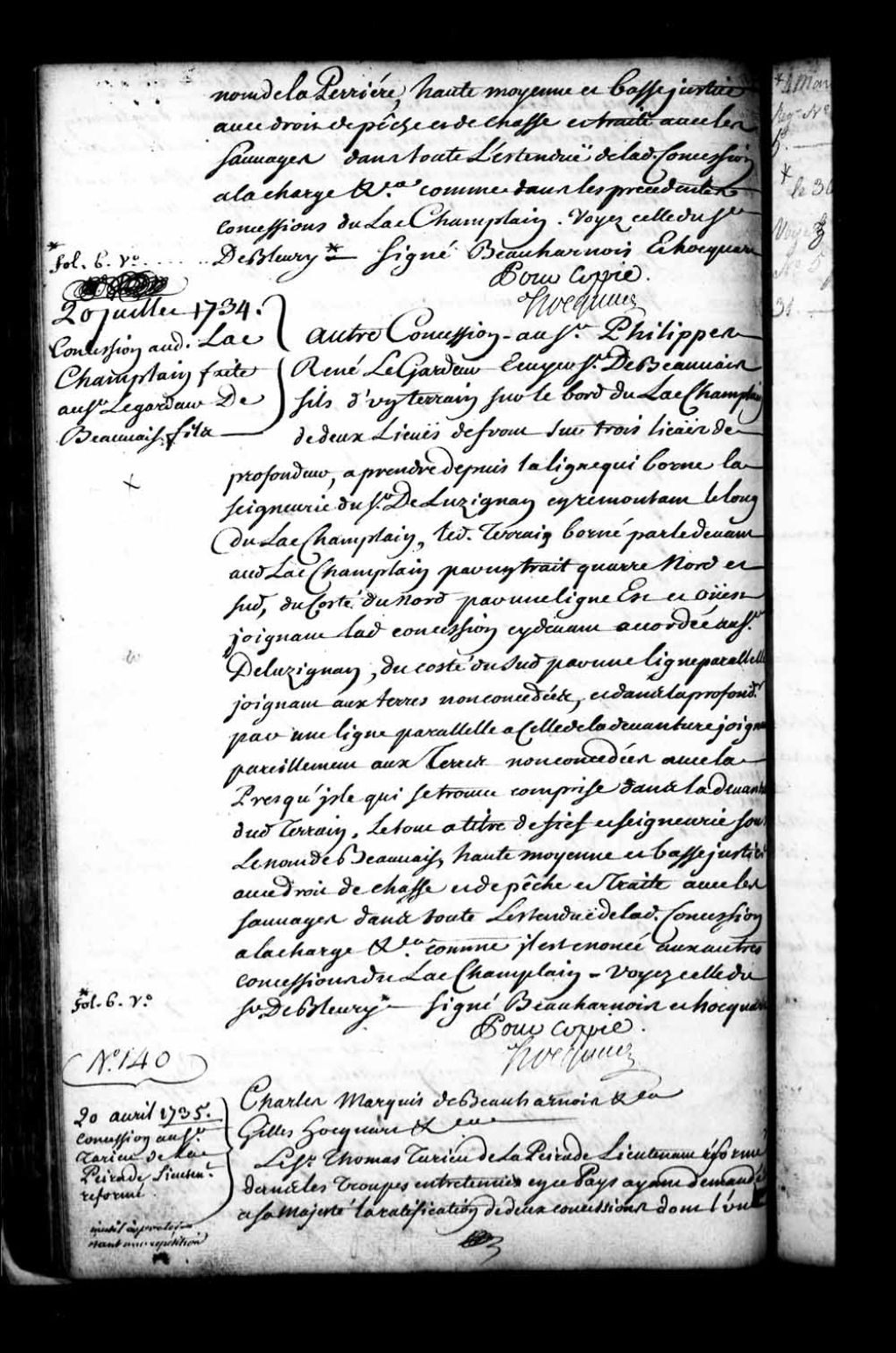 Acte de concession par Charles de Boische, Marquis de Beauharnois, et Gilles Hocquart, gouverneur et intendant de la Nouvelle-France, au sieur Philippe-René LeGardeur (Le Gardeur), écuyer, sieur de Beauvais fils, d'un terrain sur le bord du lac Champlain de deux lieues de front sur trois lieues de profondeur, à prendre depuis la ligne qui borne la seigneurie du sieur de Luzignan (Lusignan) en remontant le long du lac Champlain, ledit terrain étant borné par-devant au lac Champlain, du côté du nord par une ligne parallèle joignant ladite concession du sieur de Luzignan, du côté du sud par une ligne parallèle joignant les terres non concédées et dans la profondeur par une ligne parallèle à celle de la devanture joignant pareillement les terres non concédées, laquelle concession comprenant en outre avec la presqu'île comprise dans la devanture dudit terrain, sous le nom de Beauvais à titre de fief et seigneurie avec haute, moyenne et basse justice