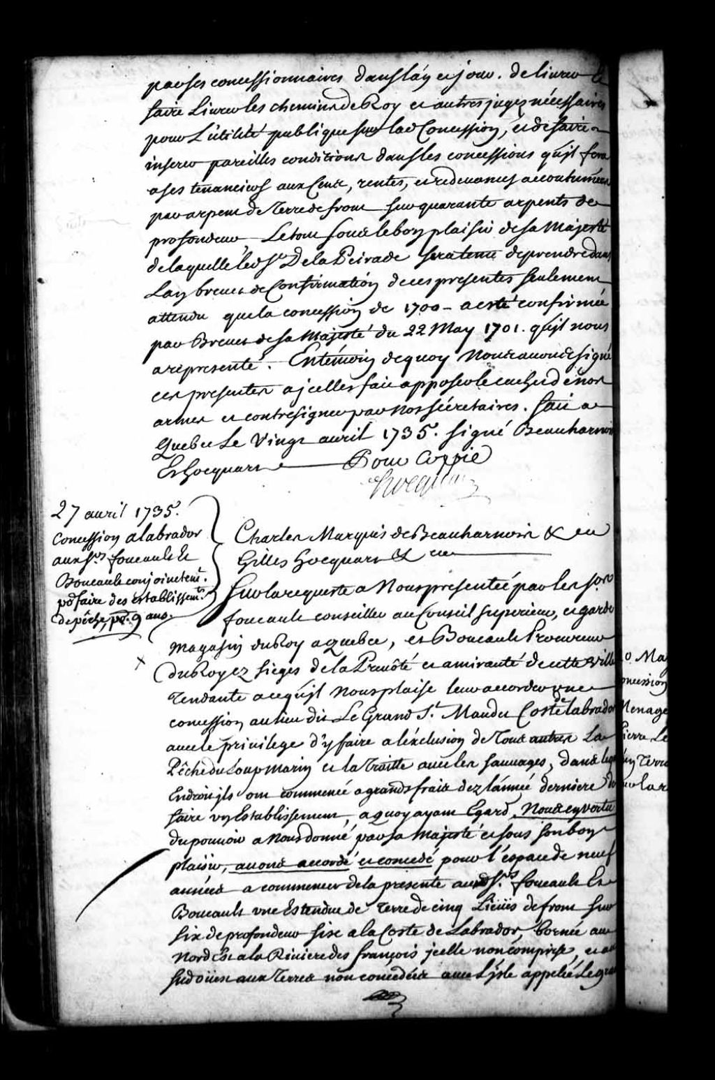 Acte de concession par Charles de Boische, Marquis de Beauharnois, et Gilles Hocquart, gouverneur et intendant de la Nouvelle-France, aux sieurs Foucault, conseiller au Conseil supérieur et garde-magasin du Roi à Québec, et Boucault, procureur du Roi au siège de la Prévôté et de l'Amirauté de Québec, d'une étendue de terre au lieu dit Le Grand Saint-Maudet, côte du Labrador, avec le privilège d'y faire à l'exclusion de tout autre la pêche aux loups-marins (phoques) et la traite avec les Sauvages (Amérindiens), laquelle étendue contenant cinq lieues de terre de front sur six de profondeur, bornée au nord-est par la rivière des Français, celle-ci n'étant pas comprise dans les limites de la concession, et au sud-ouest par les terres non concédées, laquelle concession comprenant en outre l'île appelée Le Grand Saint-Maudet (Modet) et les autres îles, îlets et battures se trouvant vis-à-vis ladite étendue de cinq lieues de front, pour l'espace de neuf années à commencer de la présente