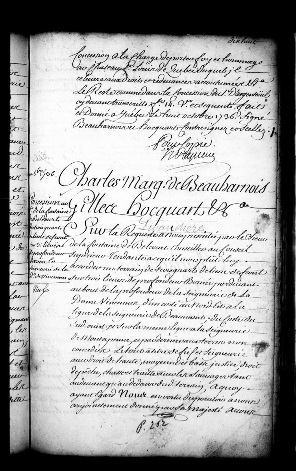 Acte de concession par Charles de Boische, Marquis de Beauharnois, et Gilles Hocquart, gouverneur et intendant de la Nouvelle-France, au sieur de Lafontaine de Belcourt, conseiller au Conseil supérieur de Québec, de l'étendue de trois quarts de lieue de front sur trois lieues de profondeur, laquelle étendue étant bornée par-devant par le bout de la profondeur de la seigneurie de la dame de Vincennes, du côté nord-est à la ligne de la seigneurie de Beaumont, du côté sud-ouest à la seigneurie de Mont-à-Peine et par-derrière aux terres non concédées, le tout à titre de fief et seigneurie avec haute, moyenne et basse justice
