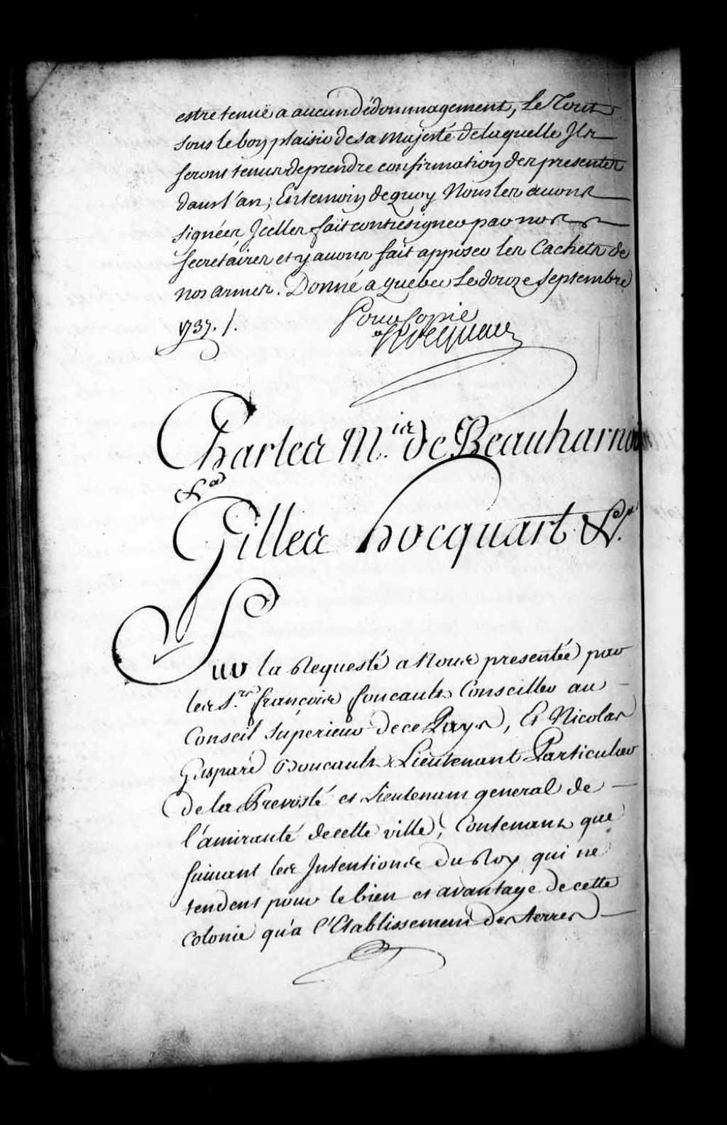 Acte de concession par Charles de Boische, Marquis de Beauharnois, et Gilles Hocquart, gouverneur et intendant de la Nouvelle-France, aux sieurs François Foucault, conseiller au Conseil souverain de ce pays, et Nicolas-Gaspard Boucault, lieutenant particulier de la Prévôté et lieutenant général de l'Amirauté de Québec, du lieu nommé Apétépy avec l'étendue de terrain le long de la côte du Nord (Labrador) qui se trouve entre les concessions des sieurs La Valterie (Lavaltrie) et de Beroüaque (Beroüague, Brouague) sur quatre lieues de profondeur, avec les îles, îlets et battures au-devant de ladite étendue, pour y faire un ou des établissements de pêche aux loups-marins (phoques), de chasse et de traite avec les Sauvages (Amérindiens), à l'exclusion de tout autre
