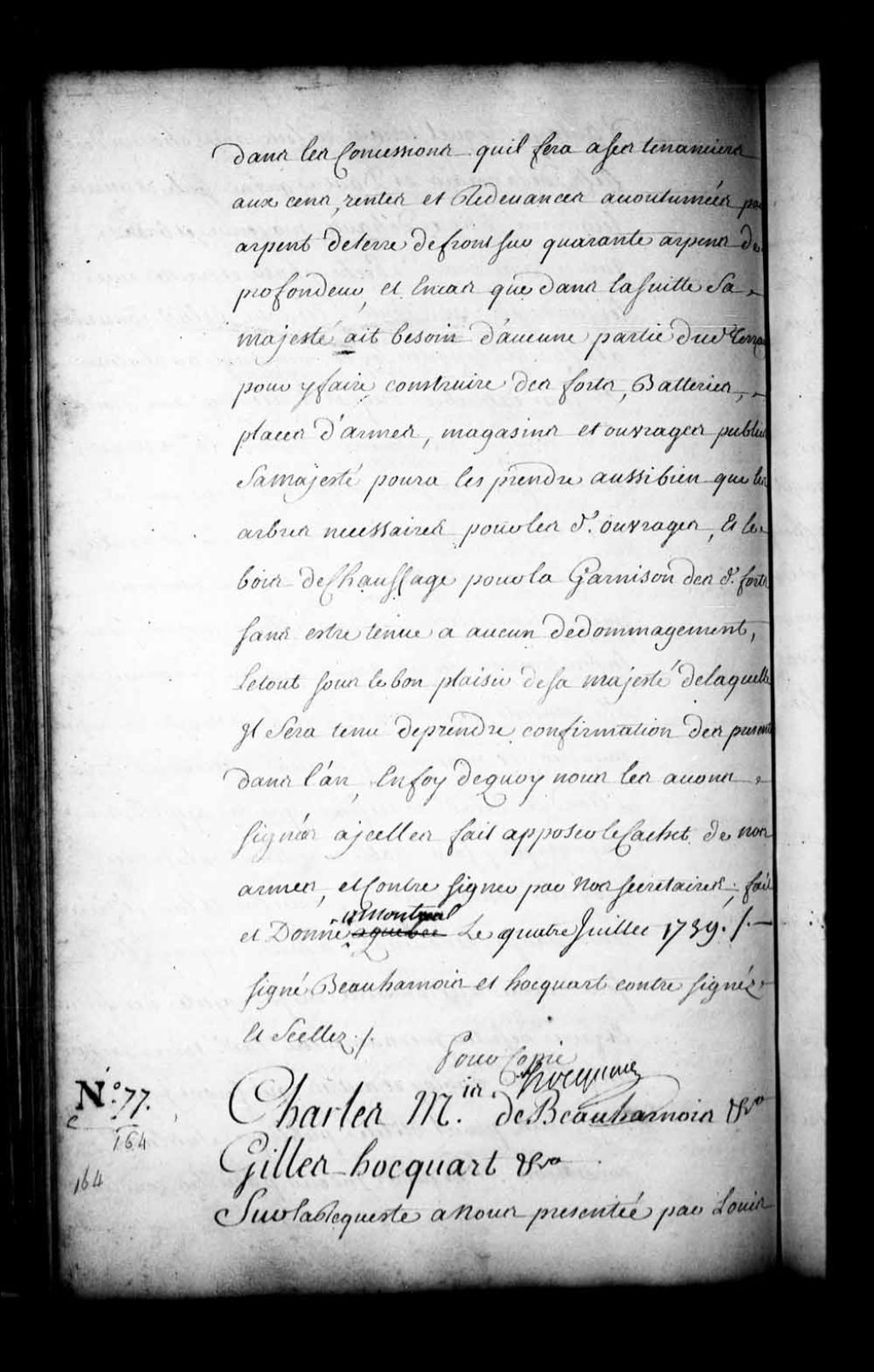 Acte de concession par Charles de Boische, Marquis de Beauharnois, et Gilles Hocquart, gouverneur et intendant de la Nouvelle-France, à Louis-Adrien Dandonneau, sieur Dusablé, enseigne dans les troupes du détachement de la Marine en ce pays, de l'étendue d'une lieue de front ou environ sise derrière la seigneurie accordée à Jean-Baptiste Le Gardeur (LeGardeur), sieur de Saint-Michel, sur trois lieues de profondeur, laquelle étendue étant bornée par-devant au bout de la profondeur de la concession du sieur Petit-Bruno (Bruneau), au nord-est par les terres dudit sieur Petit-Bruno et par la ligne de la seigneurie du sieur de Carufel, au sud-ouest par le fief du Chicot et par la ligne de continuation dudit fief et par-derrière aux terres non concédées, à titre de haute, moyenne et basse justice