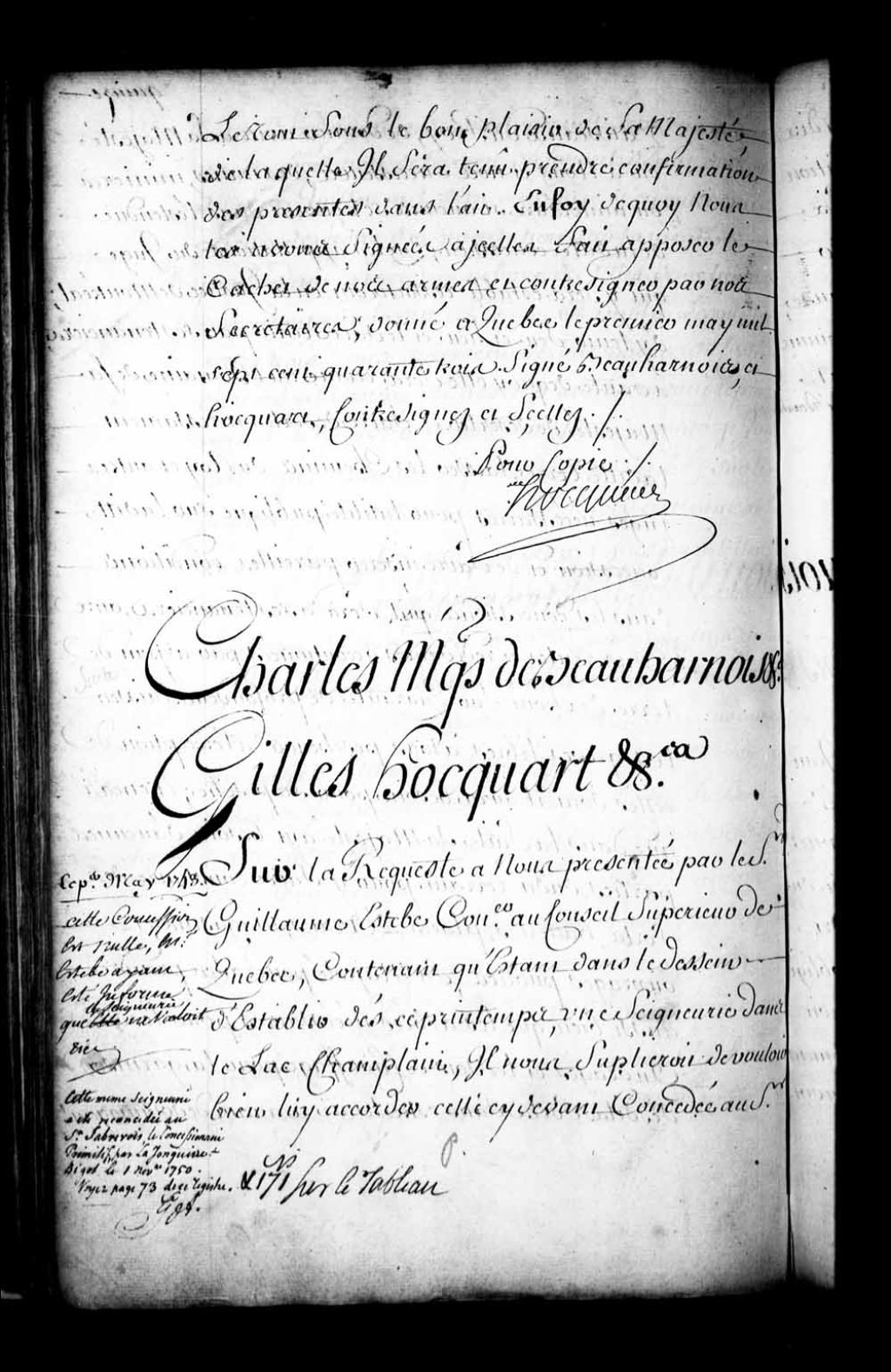 Acte de concession par Charles de Boische, Marquis de Beauharnois, et Gilles Hocquart, gouverneur et intendant de la Nouvelle-France, au sieur Guillaume Estèbe, conseiller au Conseil supérieur de Québec, de la seigneurie auparavant concédée au sieur de Sabrevois et qui a été réunie au Domaine de Sa Majesté le 10 mai 1741, laquelle concession contenant deux lieues de front sur trois lieues de profondeur et étant bornée d'un côté à celle accordée au sieur de Noyan et de l'autre côté à celle accordée au sieur de Bleury, à titre de fief et seigneurie avec haute, moyenne et basse justice, 1er mai 1743, Archives nationales à Québec, Fonds Intendants, (03Q,E1,S3,P358).