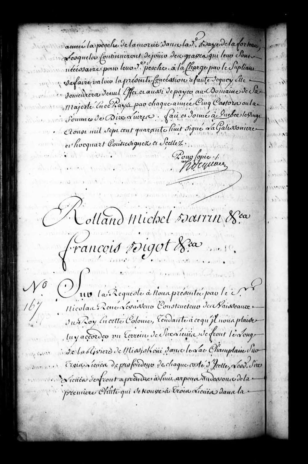 Acte de concession par Roland-Michel Barrin, Marquis de la Galissonière, et François Bigot, commandant général et intendant de la Nouvelle-France, à Nicolas-René Levasseur, constructeur des vaisseaux du Roi en cette colonie, d'une étendue de six lieues de terre de front le long de la rivière Missisquoi, dans le lac Champlain, sur trois lieues de profondeur de chaque côté, lesdites six lieues de front à prendre à huit arpents au-dessous de la première chute qui se trouve à trois lieues dans la profondeur de ladite rivière en remontant, le tout à titre de fief et seigneurie avec haute, moyenne et basse justice