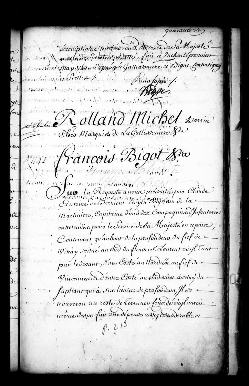 Acte de concession par Roland-Michel Barrin, Marquis de la Galissonière, et François Bigot, commandant général et intendant de la Nouvelle-France, à Claude-Antoine de Berment (Bermen), écuyer, seigneur de la Martinière, capitaine d'une des compagnies d'infanterie entretenues pour le service de Sa Majesté en ce pays, de l'étendue de terre qui se trouve à prendre au bout de la profondeur du fief de Vitré et qui est enclavée entre les fiefs de Vincennes et Livaudière au nord-est et celui du suppliant au sud-ouest, jusqu'à l'égale profondeur de six lieues que contient le fief dudit suppliant, à titre de fief et seigneurie avec haute, moyenne et basse justice