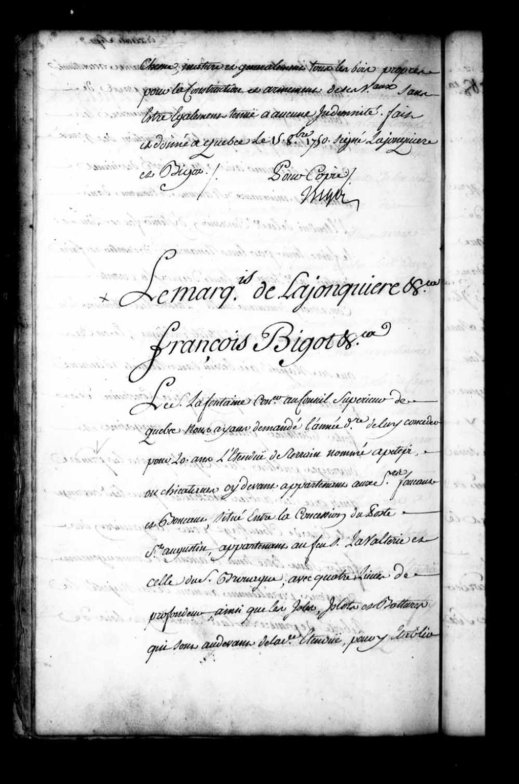Acte de concession par Jacques-Pierre de Taffanel, Marquis de la Jonquière, et François Bigot, gouverneur et intendant de la Nouvelle-France, au sieur Lafontaine, conseiller au Conseil supérieur de Québec, d'une étendue de terrain située au lieu nommé Apétépi ou Chicaticas (Chicataca), appartenant auparavant aux sieurs Foucaut (Foucault) et Boucaut (Boucault), située entre la concession du poste Saint-Augustin, appartenant au feu sieur LaValterie (Lavaltrie), et celle du sieur Brouague, sur quatre lieues de profondeur, avec les îles, îlets et battures se trouvant au-devant de ladite concession, pour y faire un ou plusieurs établissements de pêche à la baleine, à l'exclusion de tout autre, ainsi que la chasse et la traite avec les Sauvages (Amérindiens), pour le temps et l'espace de quinze années seulement à compter de l'année prochaine