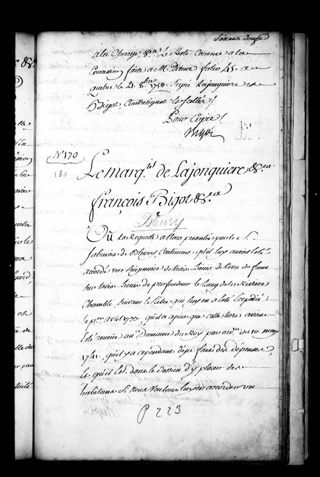 Acte de concession par Jacques-Pierre de Taffanel, Marquis de la Jonquière, et François Bigot, gouverneur et intendant de la Nouvelle-France, au sieur Sabrevois de Bleury de la seigneurie lui ayant été accordée le 1er avril 1733 et qui a été réunie au Domaine de Sa Majesté le 10 mai 1741, laquelle seigneurie étant bornée du côté du nord par la seigneurie des sieurs Hertel, du côté du sud, à trois lieues de ladite seigneurie, par une ligne tirée est et ouest, sur le devant par la rivière Chambly (Richelieu) et sur la profondeur, à trois lieues, par les terres non concédées, à titre de fief et seigneurie avec haute, moyenne et basse justice