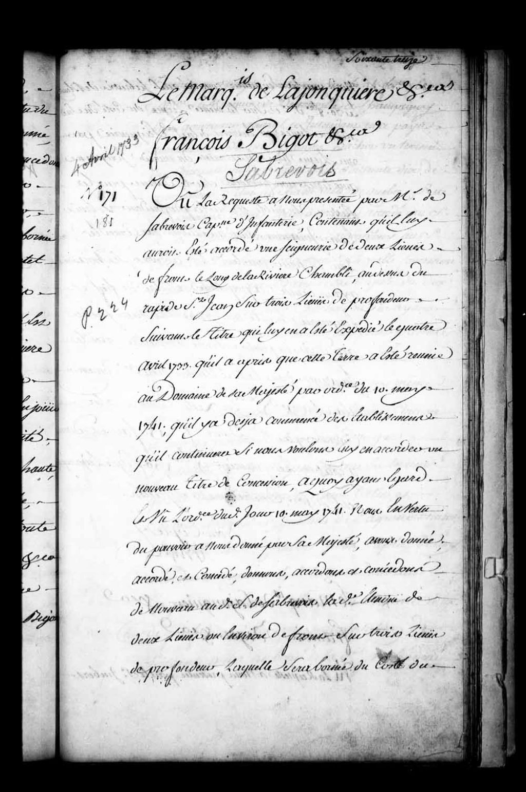 Acte de concession par Jacques-Pierre de Taffanel, Marquis de la Jonquière, et François Bigot, gouverneur et intendant de la Nouvelle-France, au sieur Sabrevois, capitaine d'infanterie, de la seigneurie lui ayant été accordée le 4 avril 1733 et réunie au Domaine de Sa Majesté le 10 mai 1741, laquelle seigneurie étant bornée du côté du nord par la seigneurie concédée au sieur Sabrevois de Bleury le 30 octobre dernier, du côté du sud, à deux lieues ou environ de ladite seigneurie, par une ligne tirée est et ouest joignant les terres non concédées, sur le devant par la rivière Chambly (Richelieu) et sur la profondeur de trois lieues joignant aussi les terres non concédées, à titre de fief et seigneurie avec haute, moyenne et basse justice
